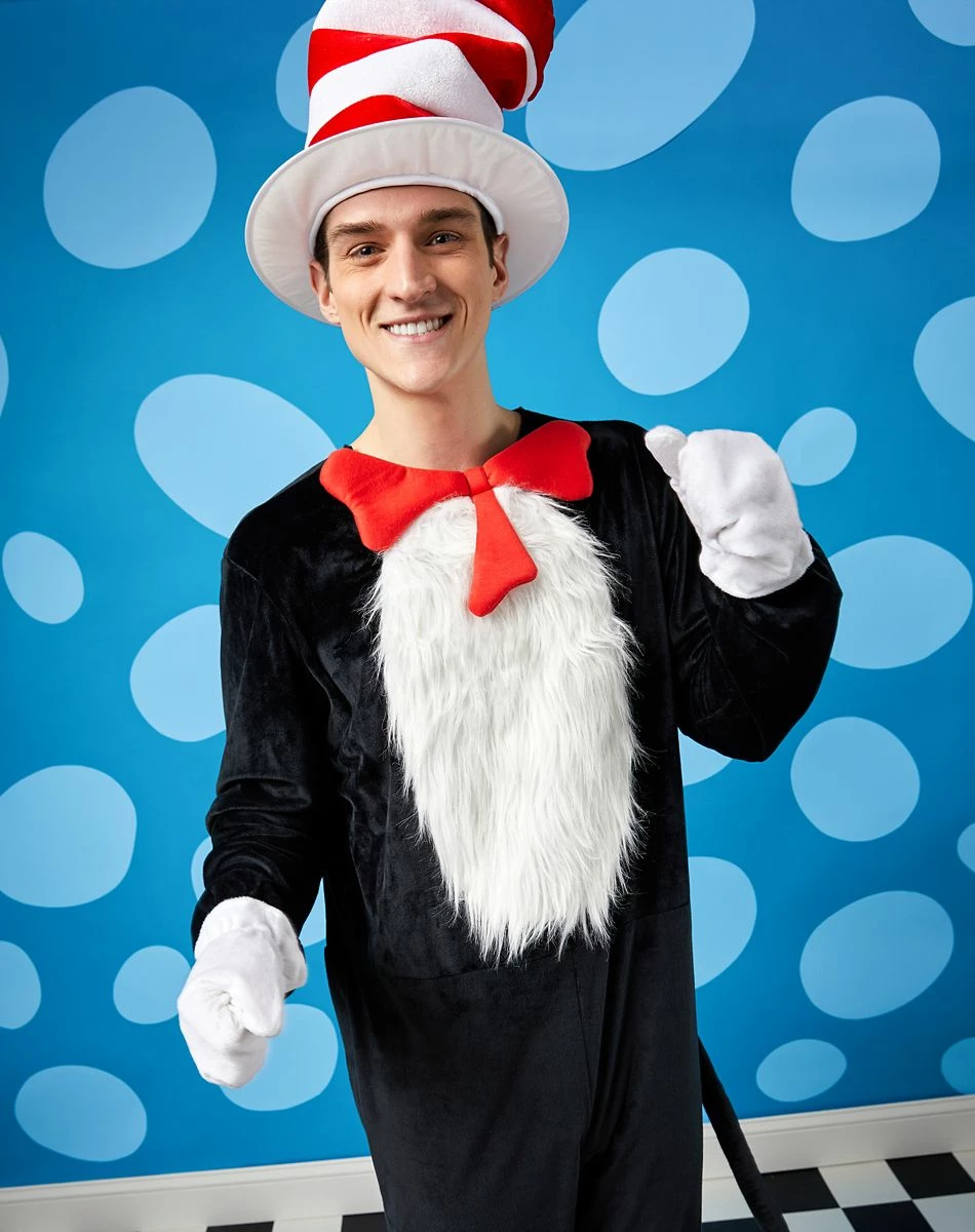 Make sure you leave enough time to create some rhymes when you dress in the officially licensed Adult Cat in the Hat costume. This black and white jumpsuit features a red bow at the neck and comes complete with gloves and oversized red and white top hat.