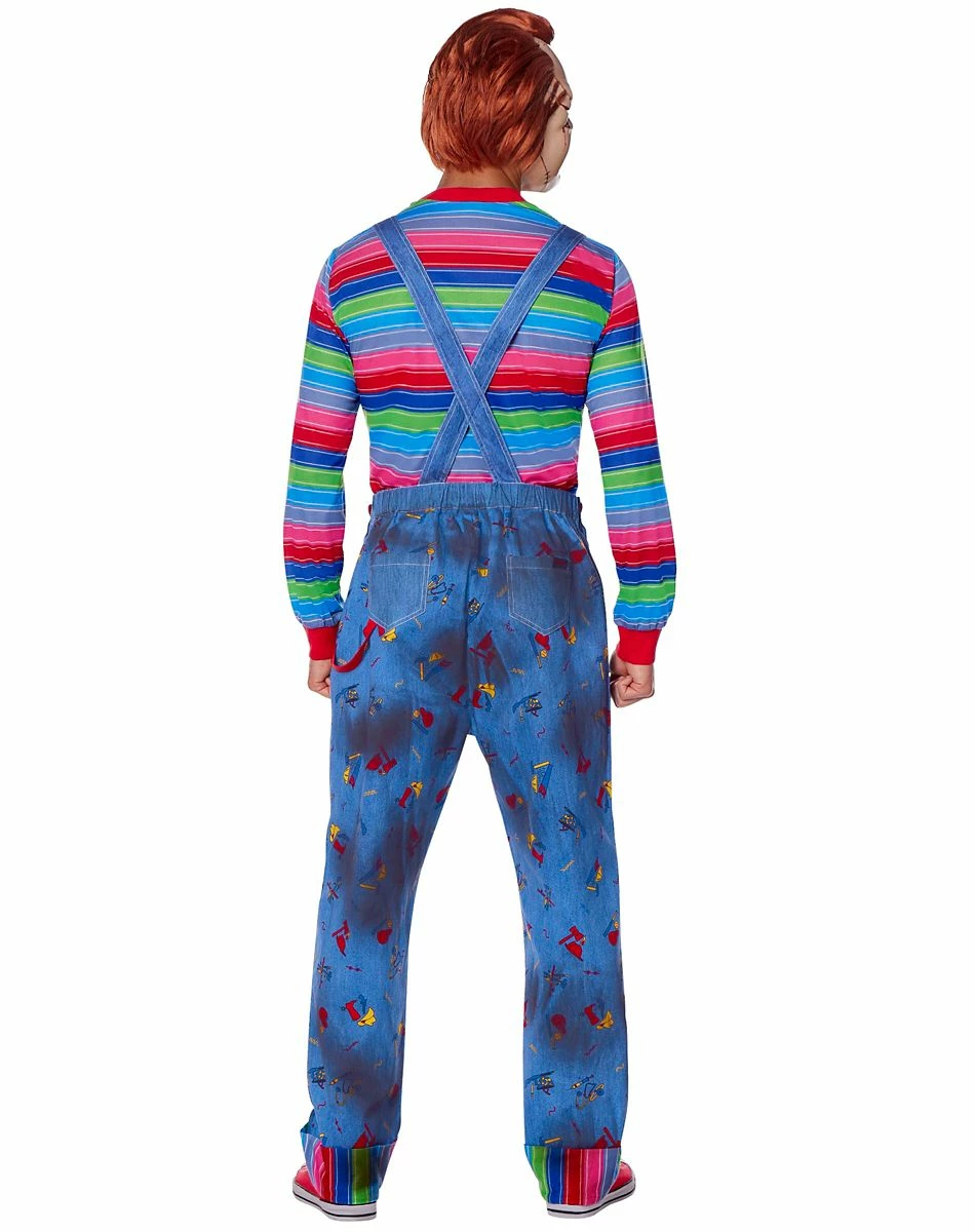 Playtime’s about to get a whole lot creepier this Halloween once you suit up in this officially licensed Adult Chucky Costume Deluxe. This high-quality costume will have you looking just like your favorite killer doll this Halloween. This costume includes a multi-colored striped long sleeve shirt, a pair of Chucky’s signature embroidered overalls, and a terrifying Chucky half mask with facial scar details to look just like you came off right of the big-screen. There’s no better way to look just like your favorite horror villain this Halloween than with this awesome deluxe Chucky costume.