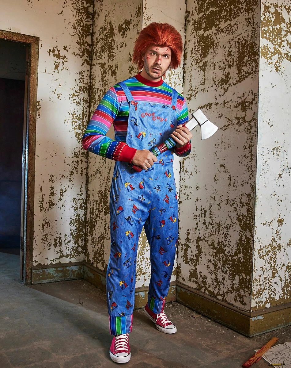 “Hi I’m Chucky wanna play?” Become the possessed doll Chucky this Halloween when you dress up in this officially licensed adult Chucky costume. You definitely won’t be seen as a good guy once you’re wearing this serial killer costume. This costume includes all the components you need to become this possessed doll including Chucky’s signature blue jumpsuit with attached striped shirt, as well as the iconic red haired Chucky wig. You’ll have everyone screaming in terror when you come at them with this serial killer child’s toy costume.