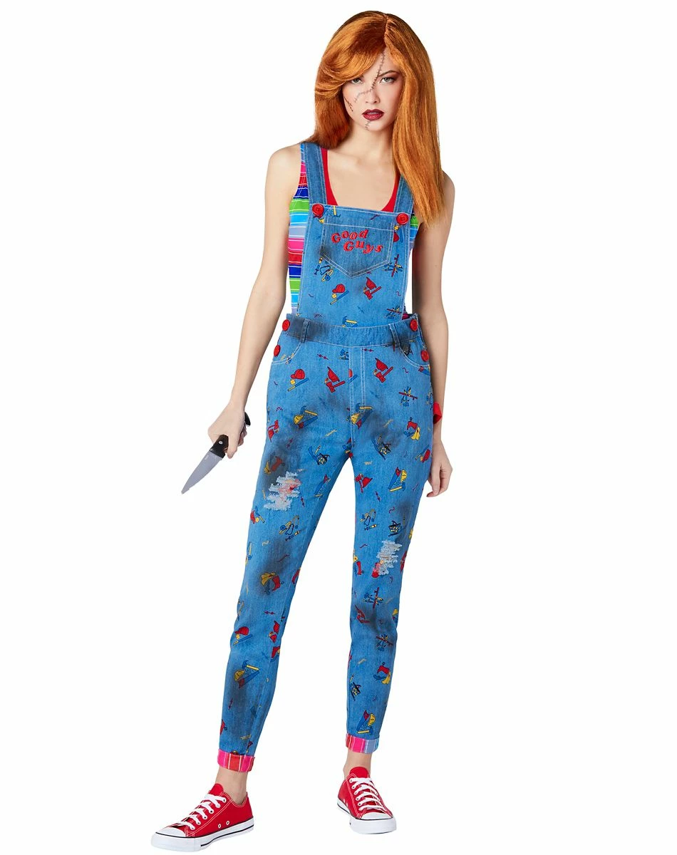Dress up as your horror movie fave in this official Adult Chucky Overalls Costume! This Chucky outfit has killer style, with blue overalls, striped shirt and red wig. You’ll be instantly recognizable when you go as Chucky for Halloween.