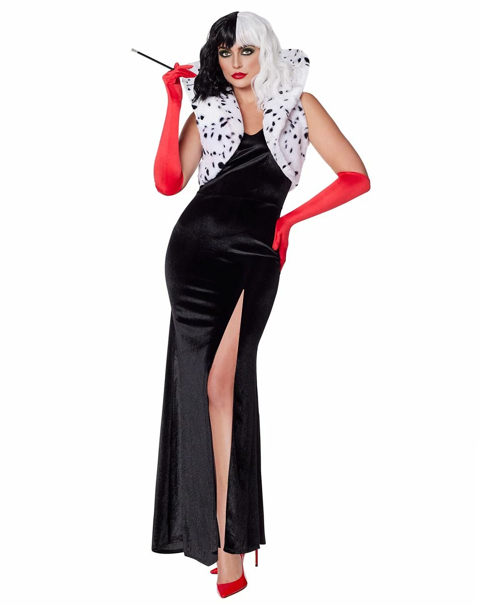 Turn yourself into a classic character with this official Disney Villains Cruella costume! With a wig showcasing her familiar black and white hair, a stylish long black dress with a black and white dotted vest and long red gloves, you’ll be sure to turn heads this Halloween. Being a villain has never been so fun or fashionable!