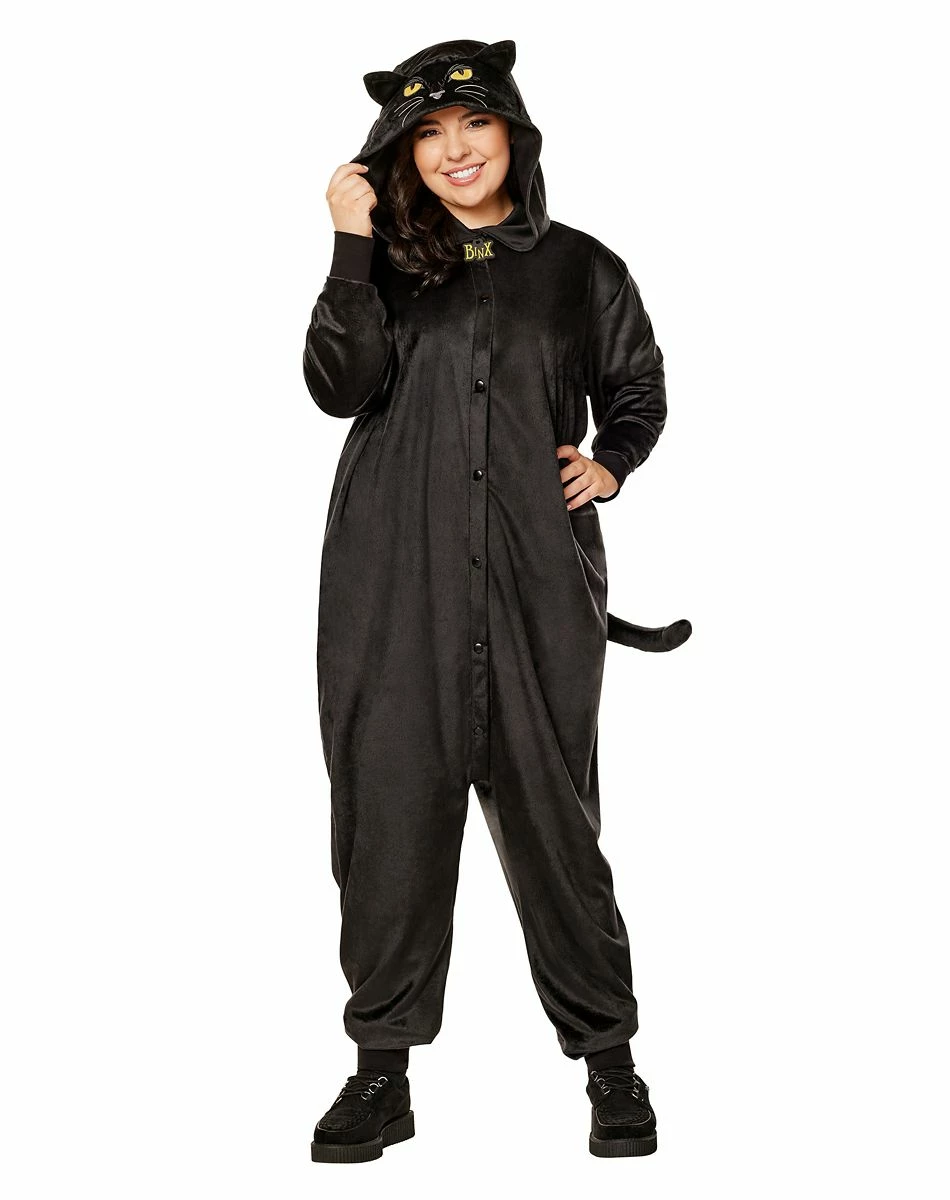 Hocus Pocus fans, dress up like your favorite black cat on film when you wear this plus size Binx Union Suit Costume! This one-piece cozy Binx costume complete with hood and tail will have you purring as you paw your way through Halloween.