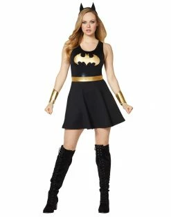 Save Gotham City in style with this officially licensed Batman dress kit! This black dress features gold detailing and a matching sparkling bat-symbol. With an included bat-eared headband and gold armbands, you’ll be out of the Batcave and patrolling the streets of Gotham in no time. Stop the Joker in his tracks on Halloween night with this heroic ensemble!