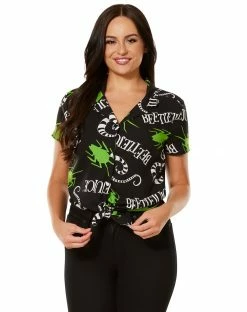 Look totally eye-catching at Halloween or any time in this Beetlejuice button down shirt! This black, white and green official Beetlejuice shirt features images of Beetlejuice in various forms and his name.