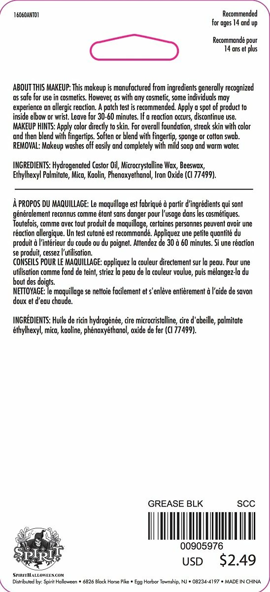 This Spirit Exclusive Black Grease Makeup can make a monster of anyone this Halloween! The 1 oz. tube is perfect for vampires, reapers, athletes, cats or any other monstrous blended look you can think of. It’s easy to apply, easy to wash off and looks great!