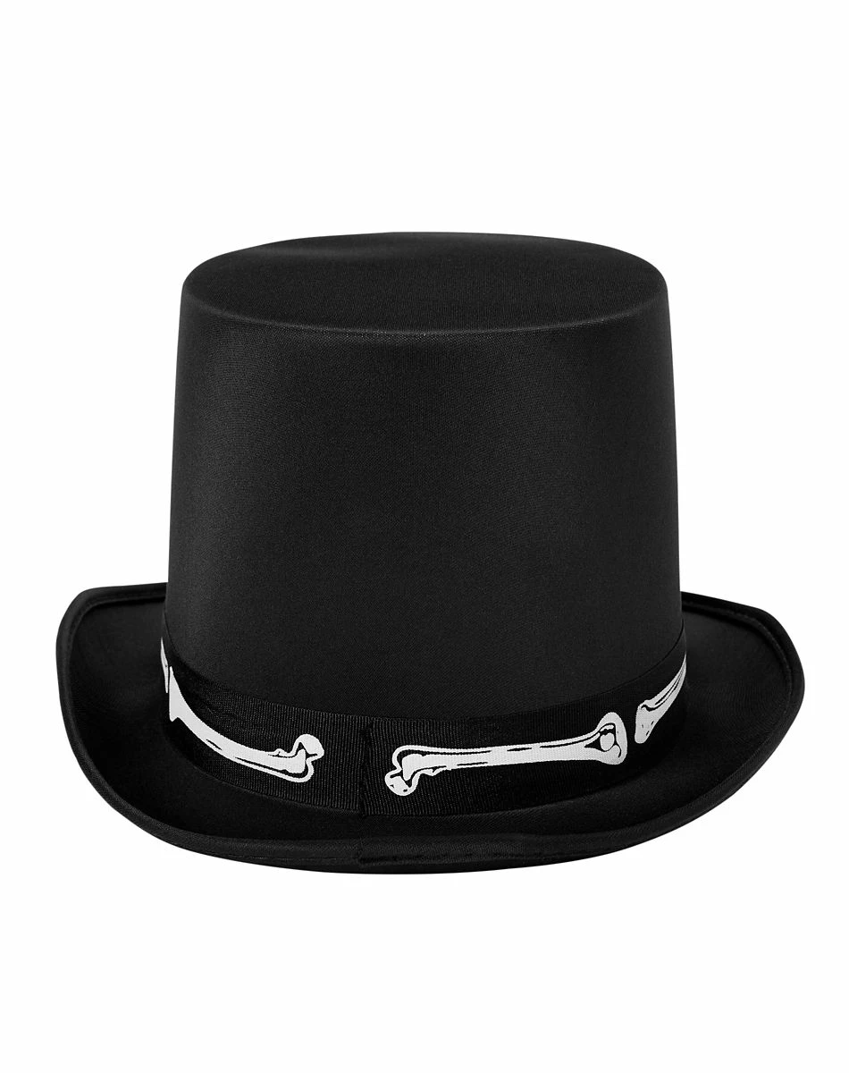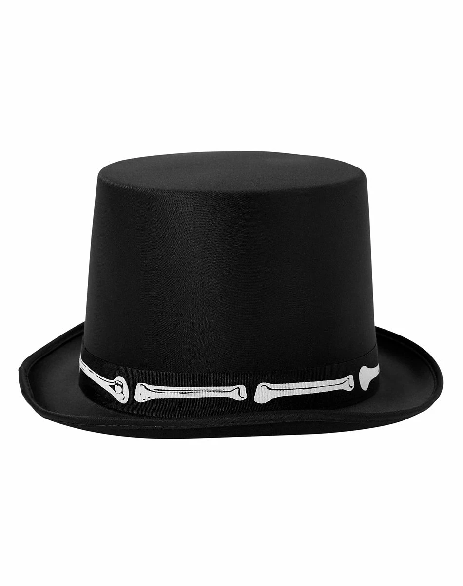Complete your Halloween costume with this stylish Black Skeleton Top Hat! It features a skeleton bone band that wraps around the hat, instantly adding a dark vibe to your outfit.