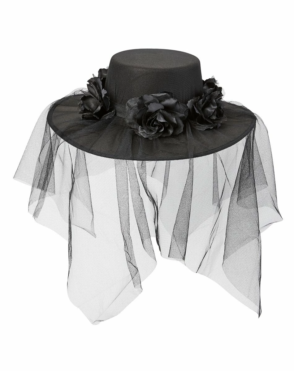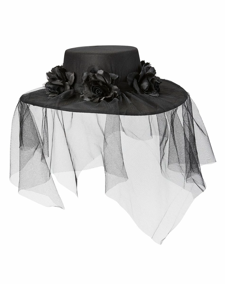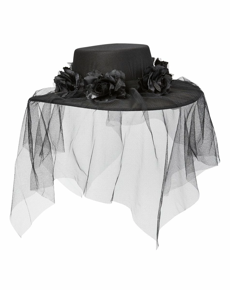 Top off your Day of the Dead costume with this veiled black hat! This hauntingly elegant hat features black flower accents and a sheer black veil for a stunning Day of the Dead look.