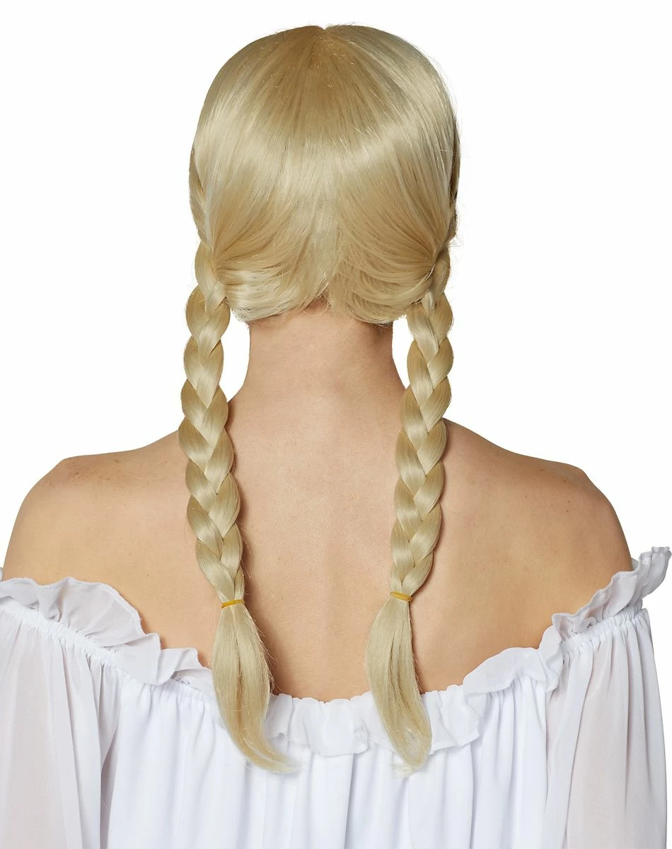 Start off the Halloween season with a bang by going blonde! Now you can easily change up your do without any hassle. Top off any great costume with a touch of blonde when you wear this wig featuring perfectly maintained braided pigtails, along with some bangs in the front that fully complete your transformation. This wig is an excellent addition for anybody looking for an innocent look.