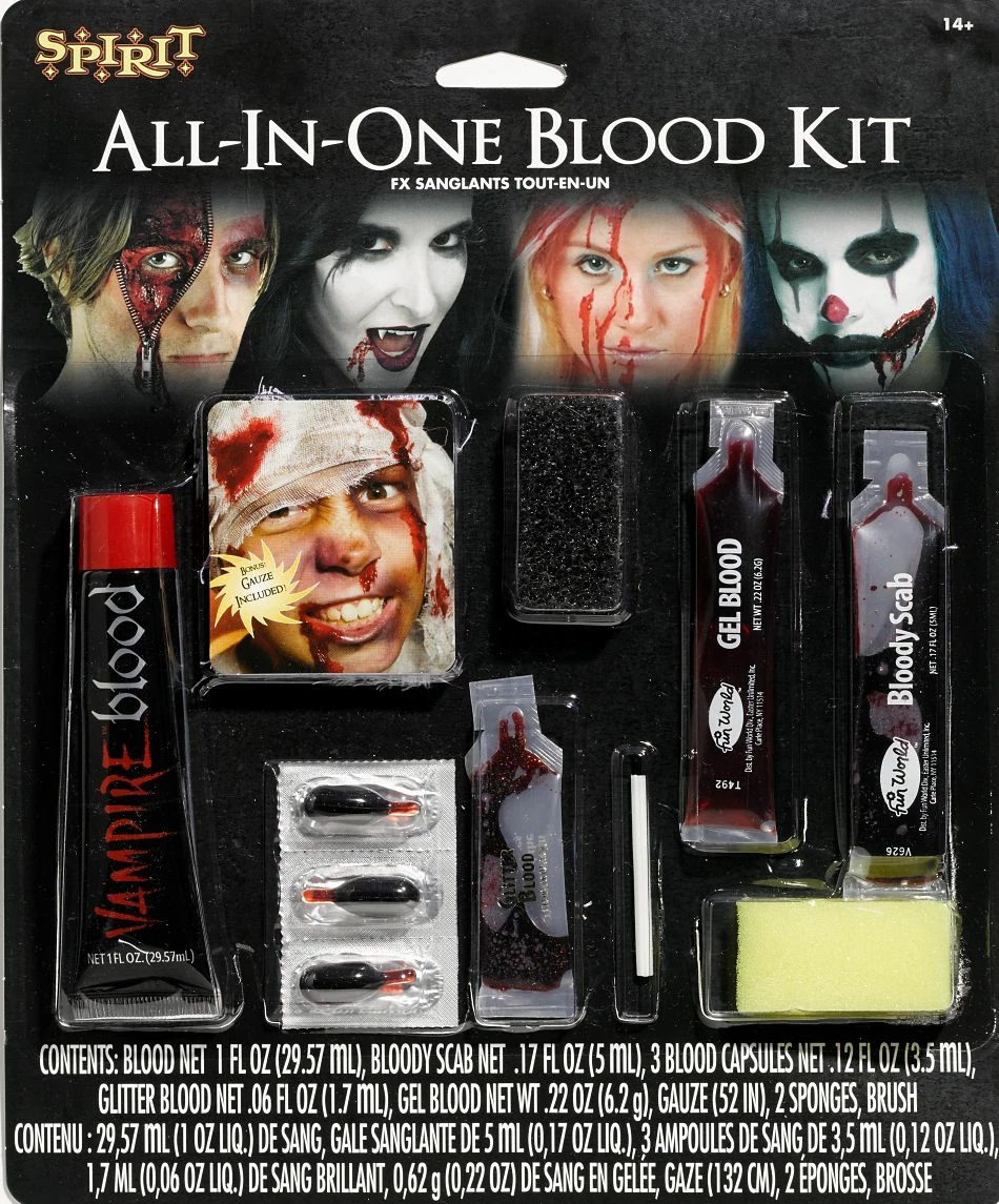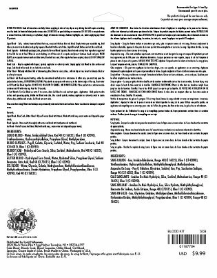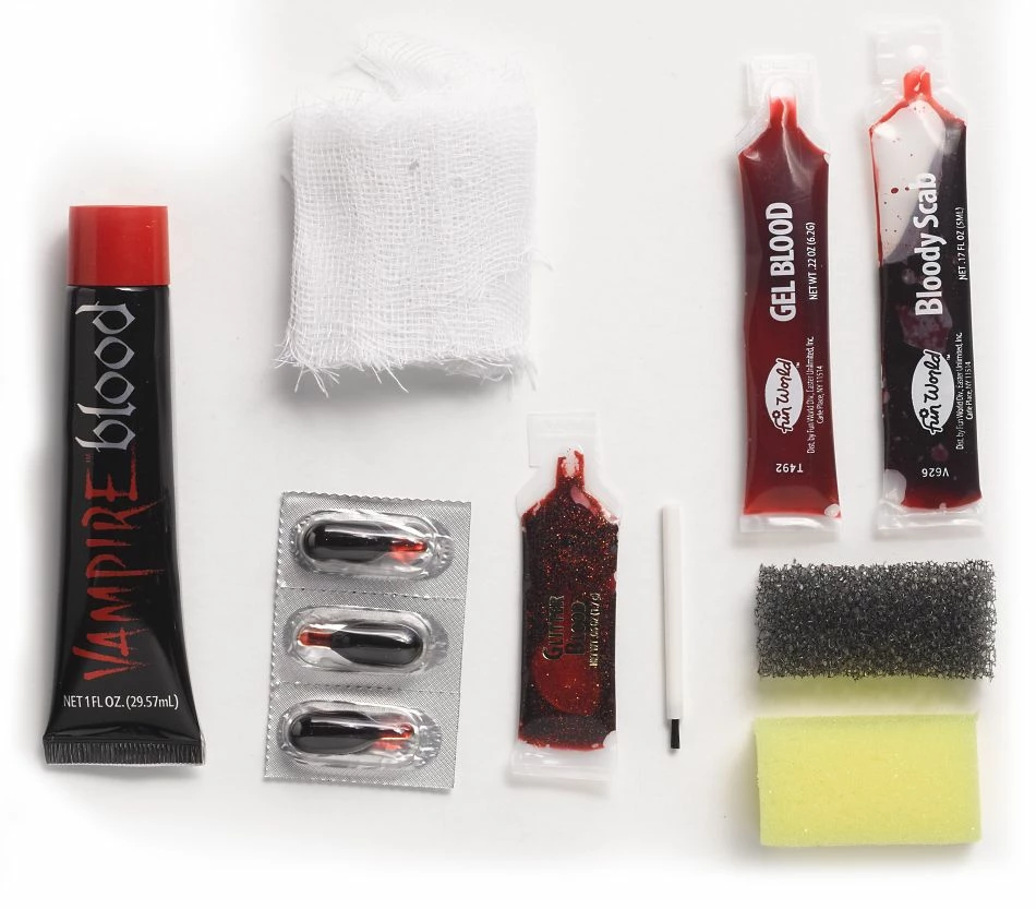 Scratches, bruises, scabs, gashes, cuts, stitches – you name it! There will be blood when you use this Blood Kit complete with blood, glitter blood, 3 blood capsules, brush, bloody scab, gel blood, and 2 sponges.