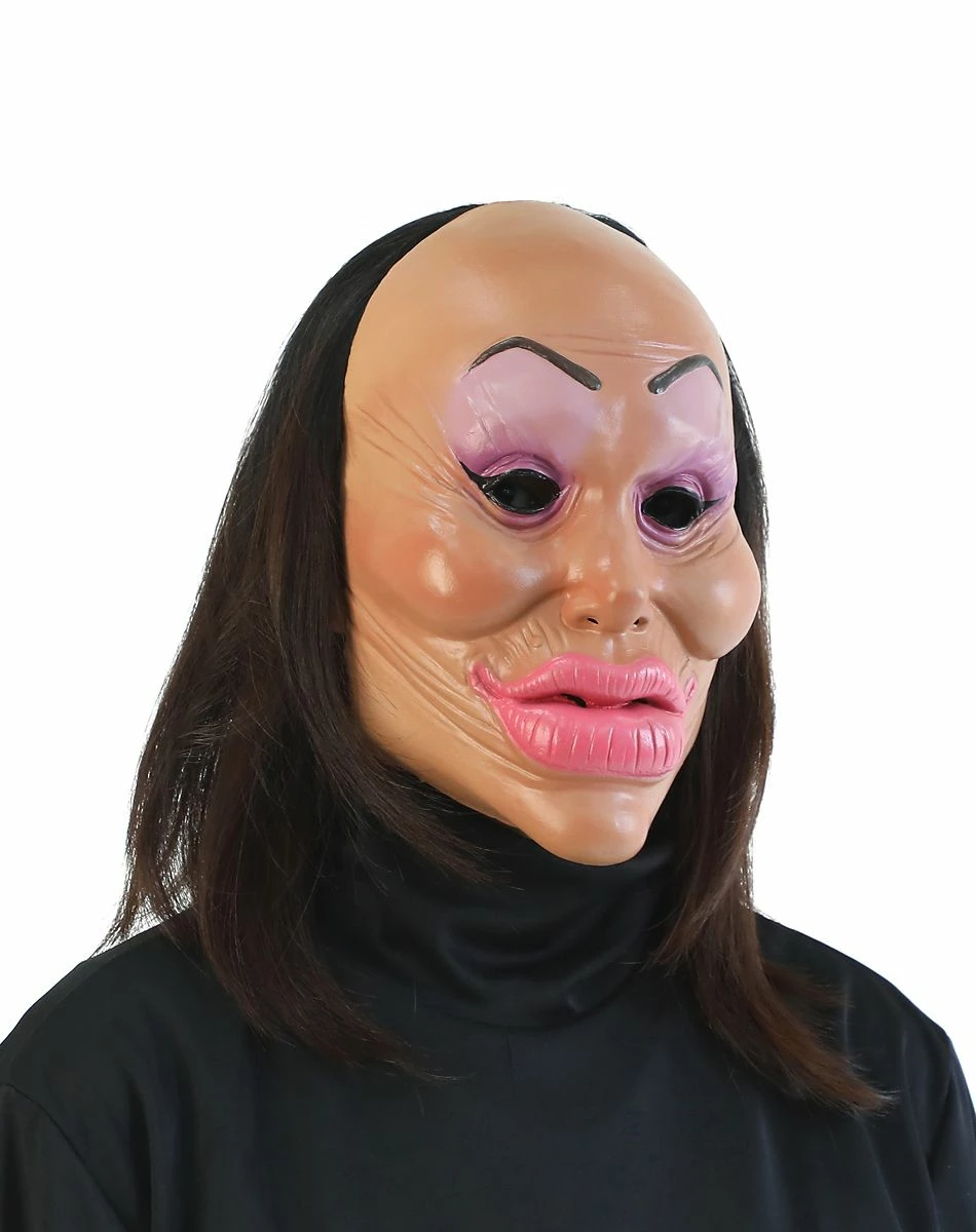 Talk about scary! If you want to go for a look that will be a real scream this Halloween, this Botched Babe Half Mask is for you. With her huge cheeks, gigantic pink lips and distorted feature, this babe will make you look like your plastic surgeon has gone berserk.