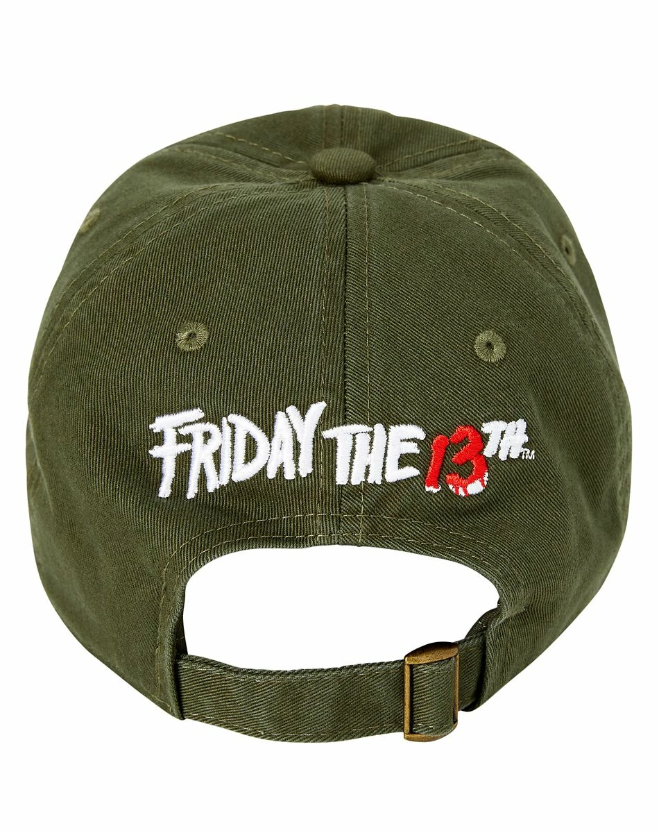 Welcome to Camp Crystal Lake! This cool and comfortable dad hat features front and back embroidery details, an adjustable slide back closure, and casual distressed details.