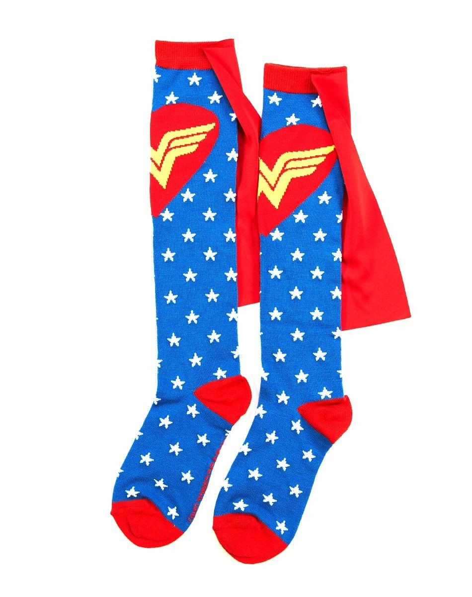 You’re sure to look fly in these officially licensed Wonder Woman Star Fashion Caped Socks! These awesome socks are a bright blue with white stars and red accents, as well as a red heart with the Wonder Woman logo. The red cape attached at the top will set these socks apart as super!