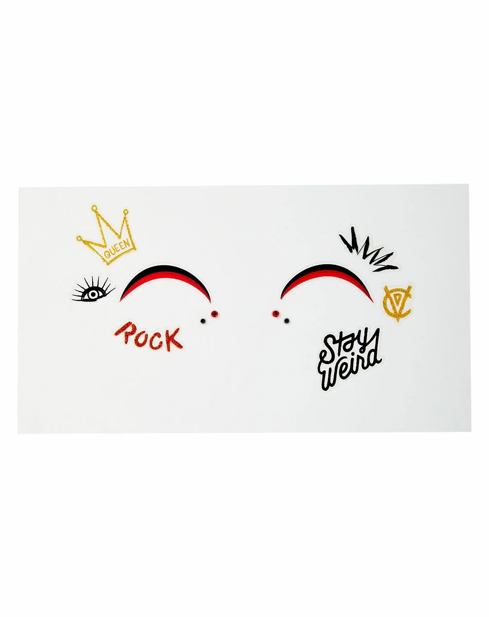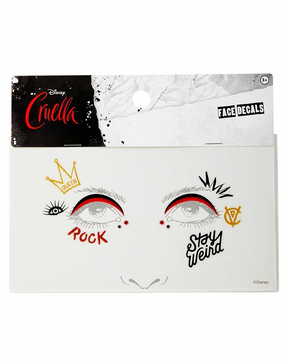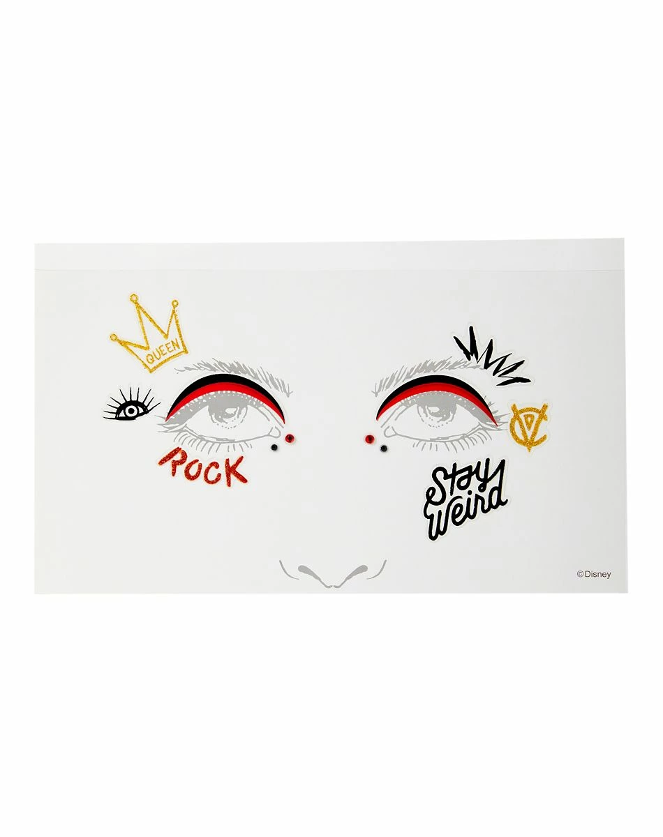 Look like your favorite Disney villain when you adorn yourself with these official Cruella Face Decals! These decals say “Rock” and “Stay weird” as well as featuring a queen’s crown and red and black eyebrows. They’re the perfect way to complete your Cruella costume (sold separately).