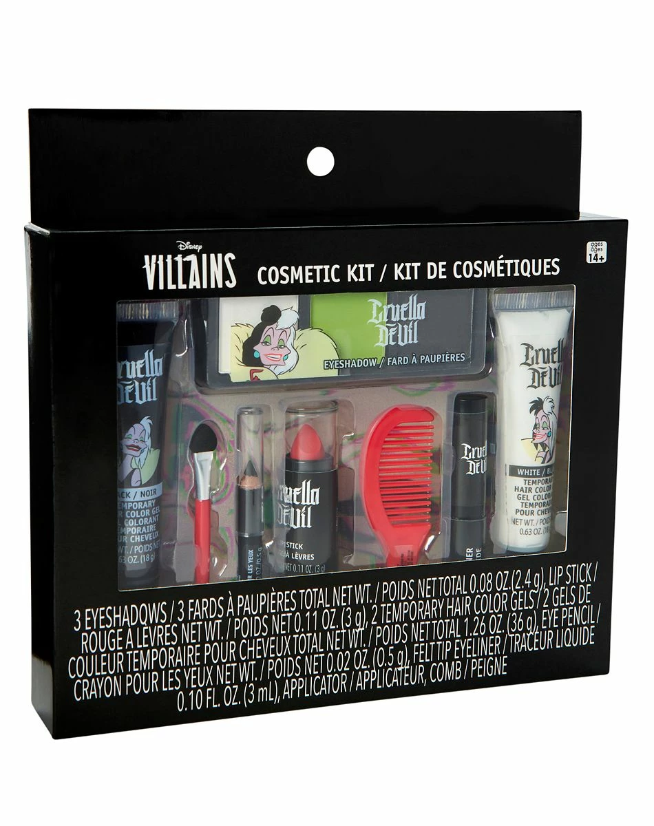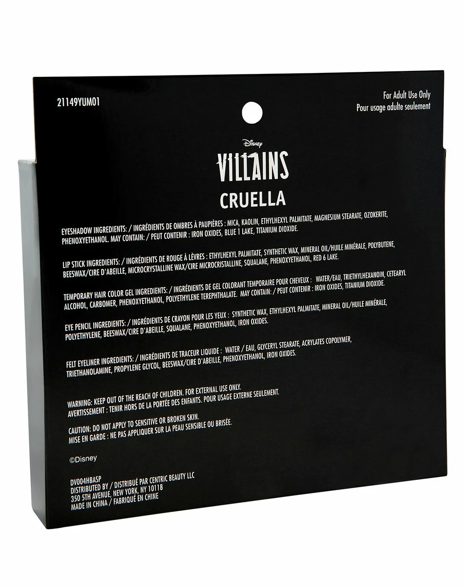 Put the perfect finishing touch on your look with this official Cruella Makeup Kit! You’ll look just like your favorite Disney villain with this makeup kit, including temporary hair color and fake eyelashes. Be instantly recognizable as Cruella with this fun makeup kit.