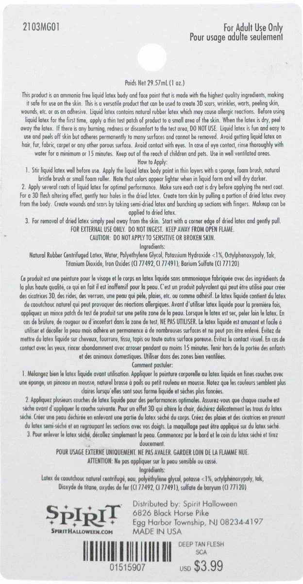 Make this Halloween a spooky one when you use this Deep Beige Flesh Liquid Latex! You can easily add 3D effects like scars, wrinkles, wounds and peeling skin for a horrifying look that’s sure to impress and terrify. This liquid latex makeup is nontoxic and ammonia free, and makes it easy to customize your Halloween image.