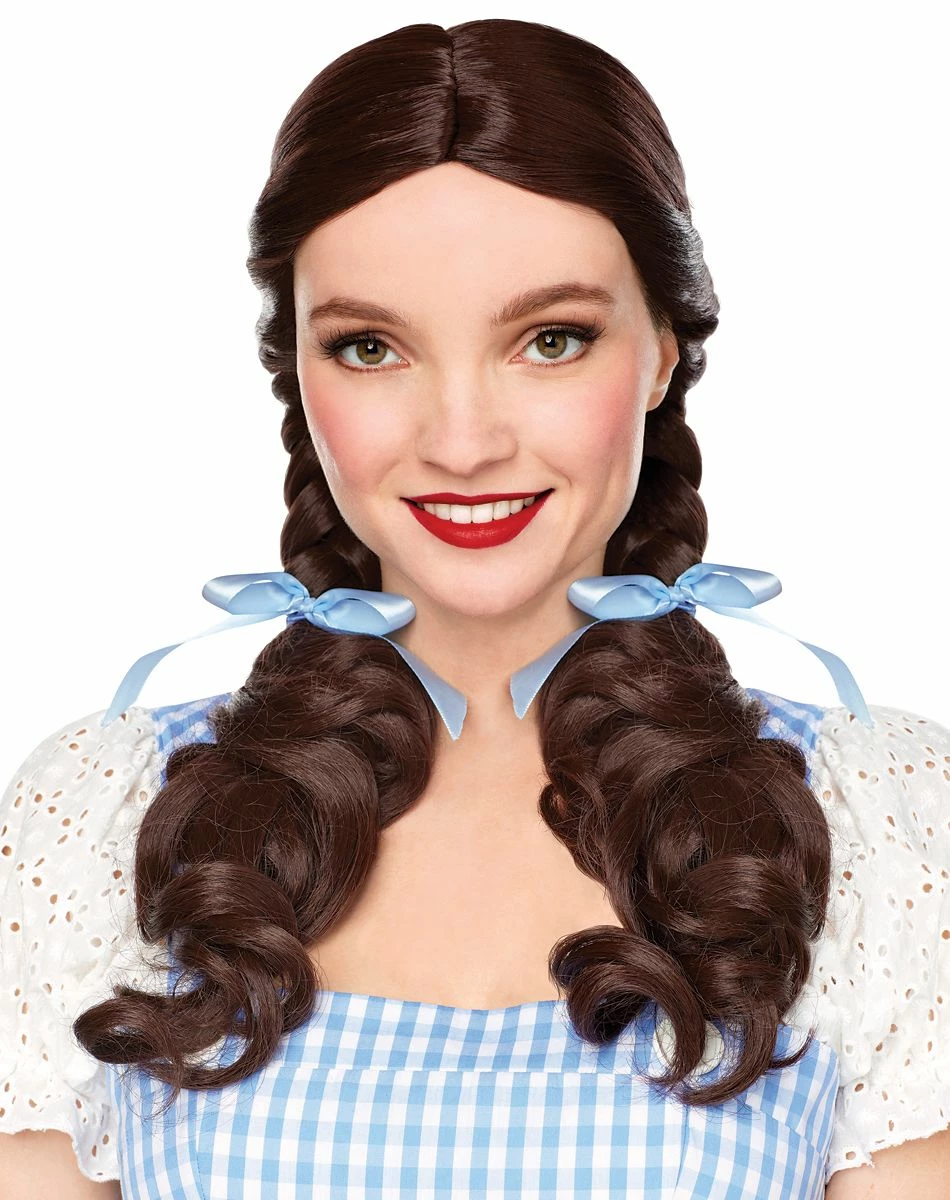 Complete your Dorothy look with this Wizard of Oz wig! This wig features long, brown, curly hair parted down the center. Two silky braids are secured with baby blue bows.
