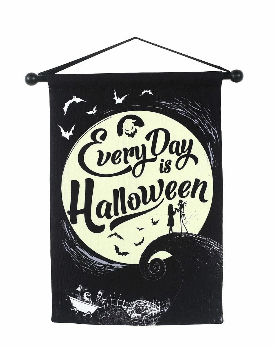 Every day is Halloween! This officially licensed The Nightmare Before Christmas scroll sign features Jack and Sally surrounded by the light of the moon and (of course) Oogie Boogie. Hang this scroll sign in your space to spread the spooky spirit!