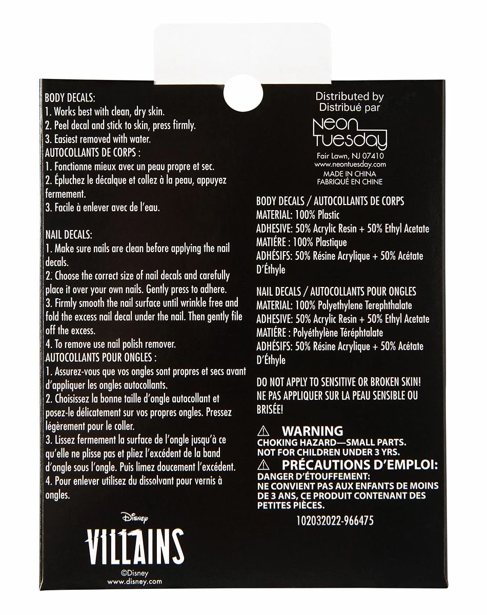 Complete your Evil Queen look with this fashion decals. Coming complete with 5 body decals, and 14 nails stickers, you’ll be sure to complete your Disney Villains costume.