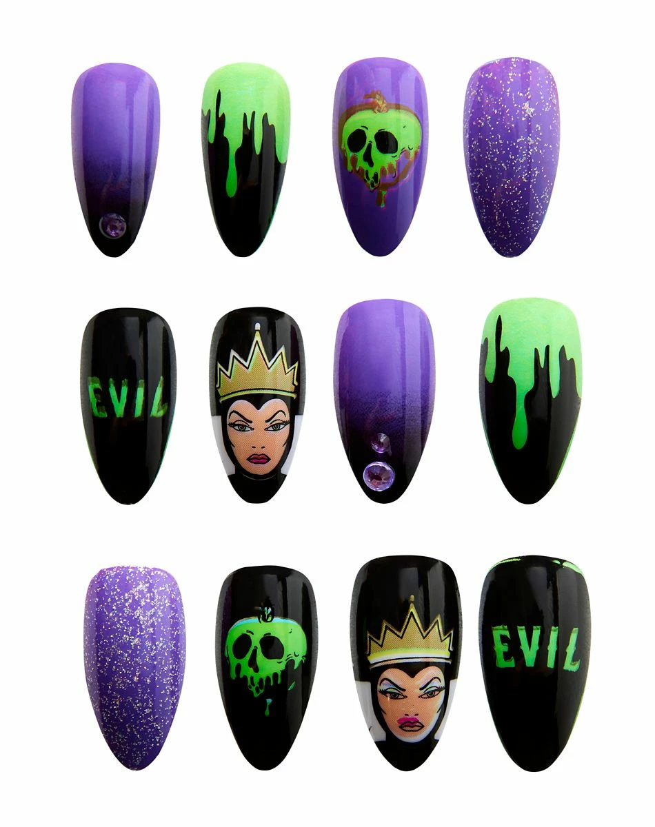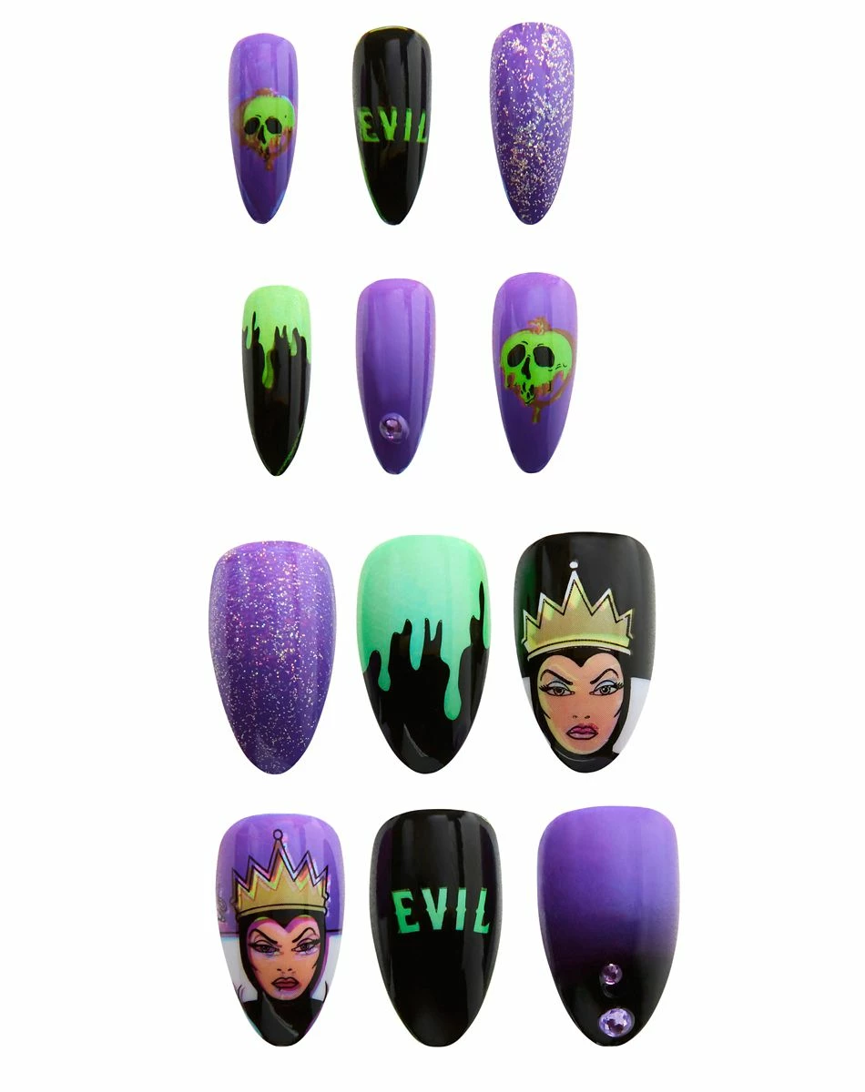 Your fingers will stand out on Halloween or any time when you put on these official Disney Villains Evil Queen Press On Nails! These colorful nails feature bright purple, black and silver designs that will make you look truly regal and ready to be your most evil self.