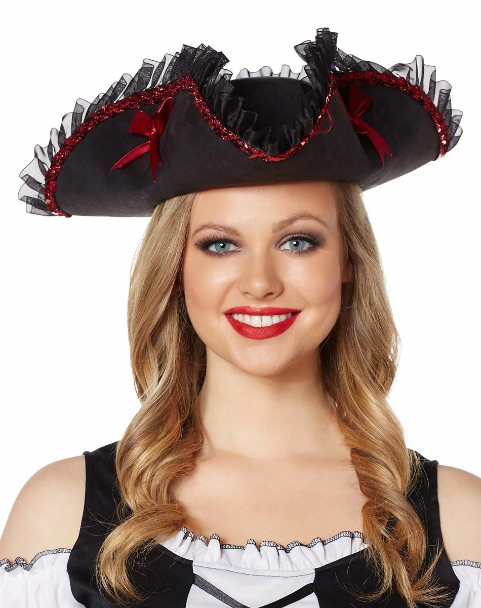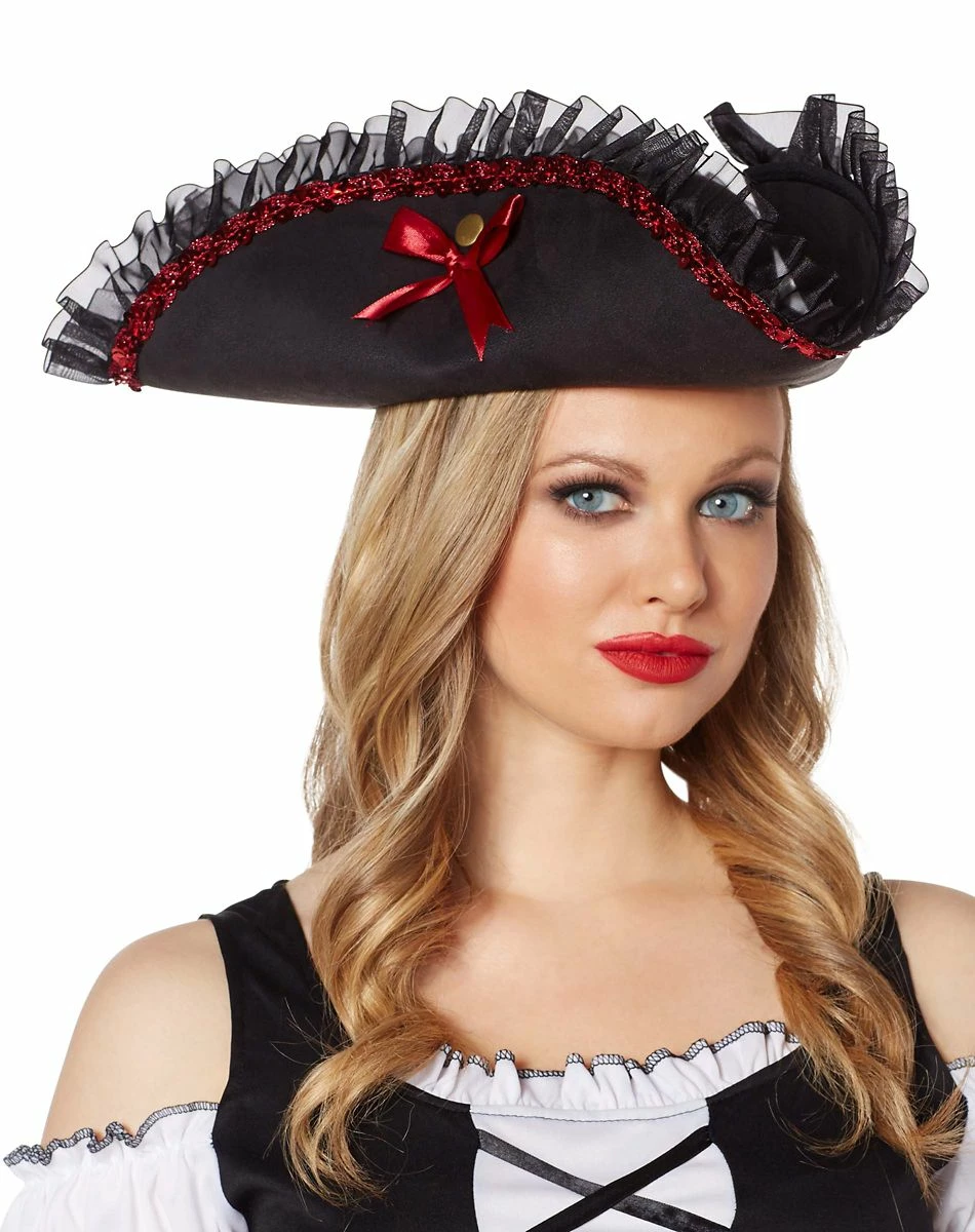 AHOY MATEYS! Celebrate Halloween like a swashbuckling pirate this year when you add this female pirate hat to your costume. This black pirate hat features an eloquent red ribbon along the brim as well as some black sequence to complete the look. You’ll be ready to conquer the seven seas once you equip yourself with this black pirate’s hat.