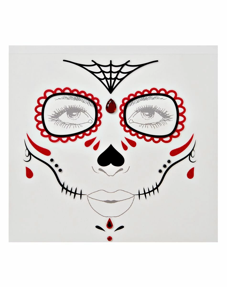 Instantly have a skull face with these Day of the Dead Decals! You don’t need makeup skills – just use this kit and you’ll have the signature flower eyes, skeleton nose and mouth, and cute flowers!