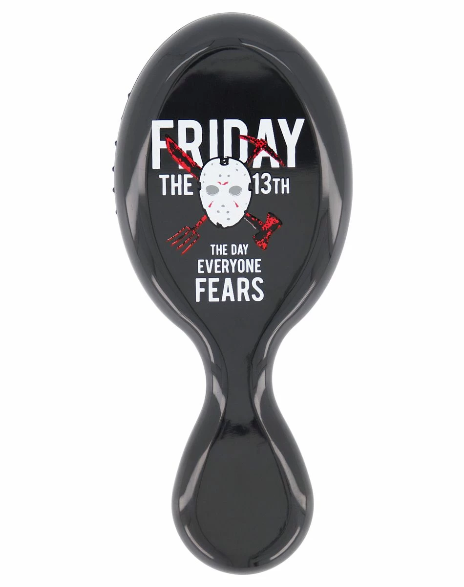 Celebrate your favorite horror movie every time you use this official Friday the 13th hairbrush! This portable black hairbrush shows Jason Voorhees in his mask and says “Friday the 13th the day everyone features” on the back.