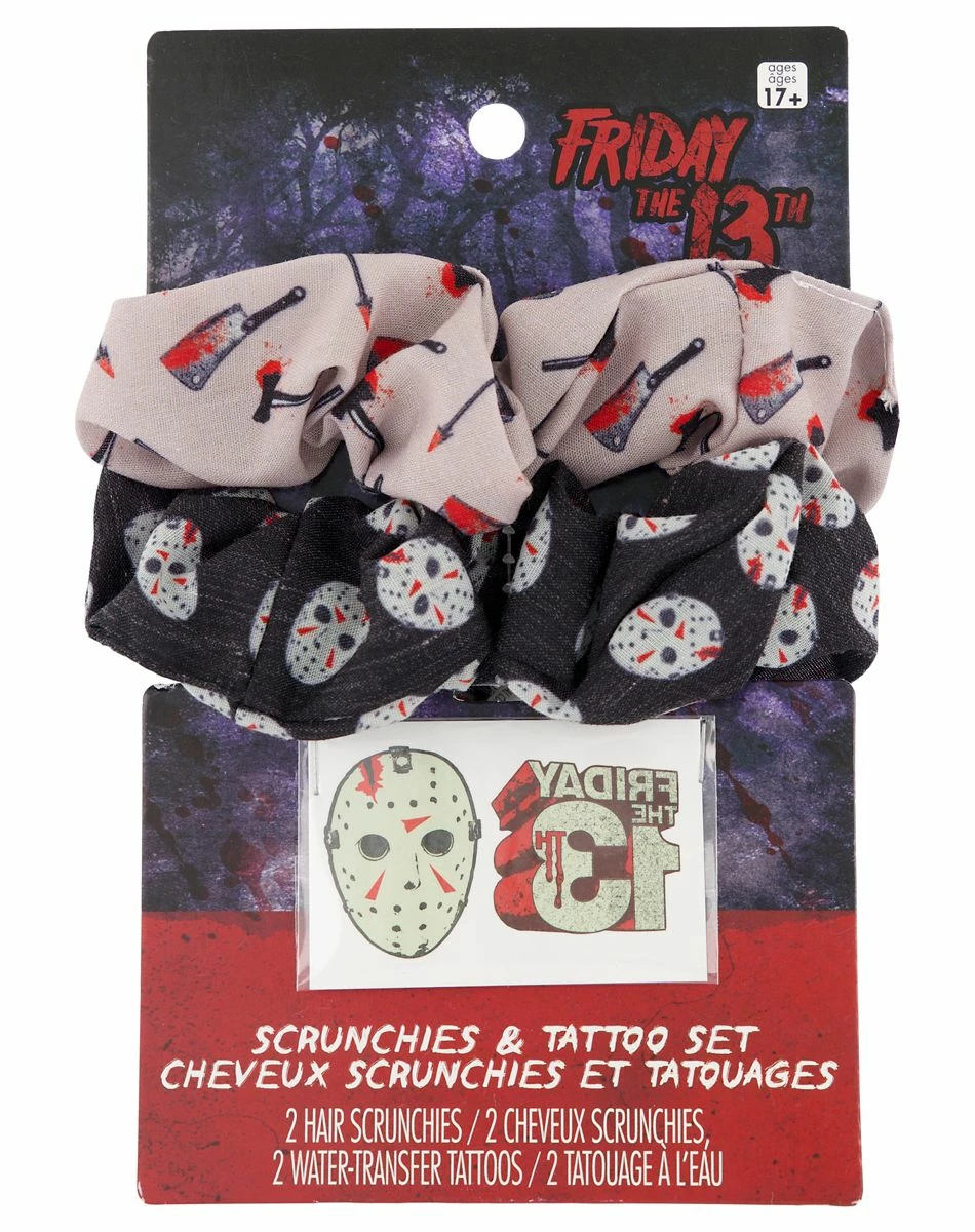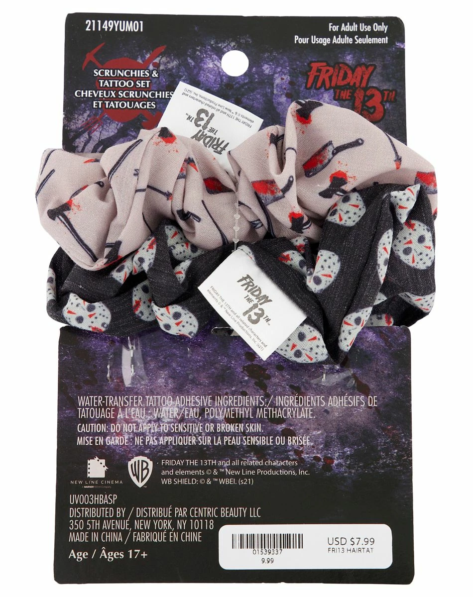 Make your favorite horror movie part of your outfit any time with these official Friday the 13th Scrunchie and Temporary Tattoos! This fun set features scrunchies with Jason Voorhees in his mask and his weapons, and temporary tattoos to let you show how big a Friday the 13th fan you are!