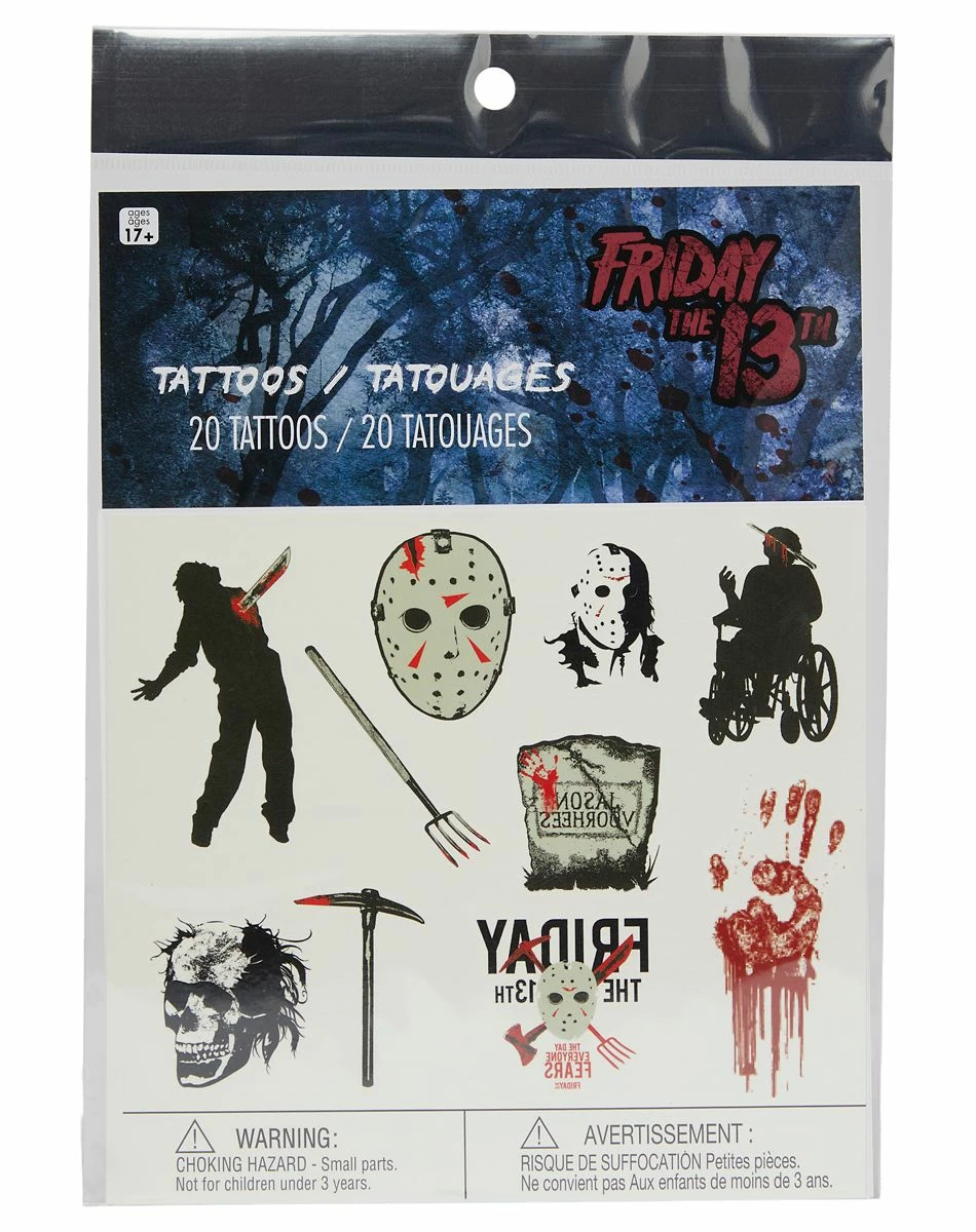 Add some killer embellishments when you wear these Friday the 13th temporary tattoos! Choose from Jason Voorhees in his infamous mask to a bloody knife and other weapons. These Friday the 13th tattoos are easy to put on and perfect for any horror movie fan.