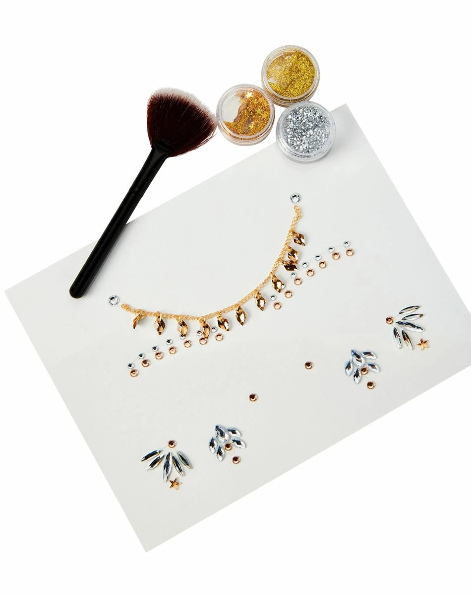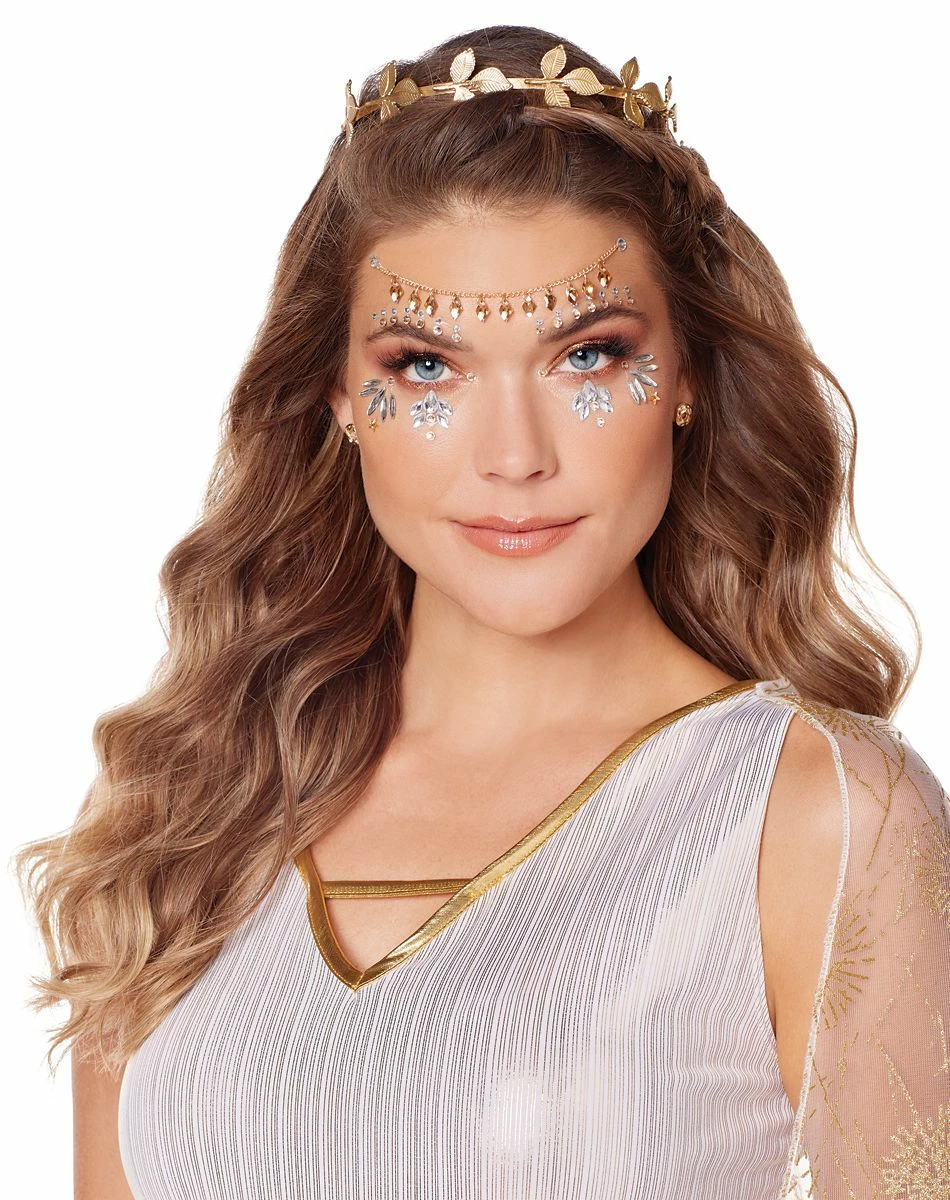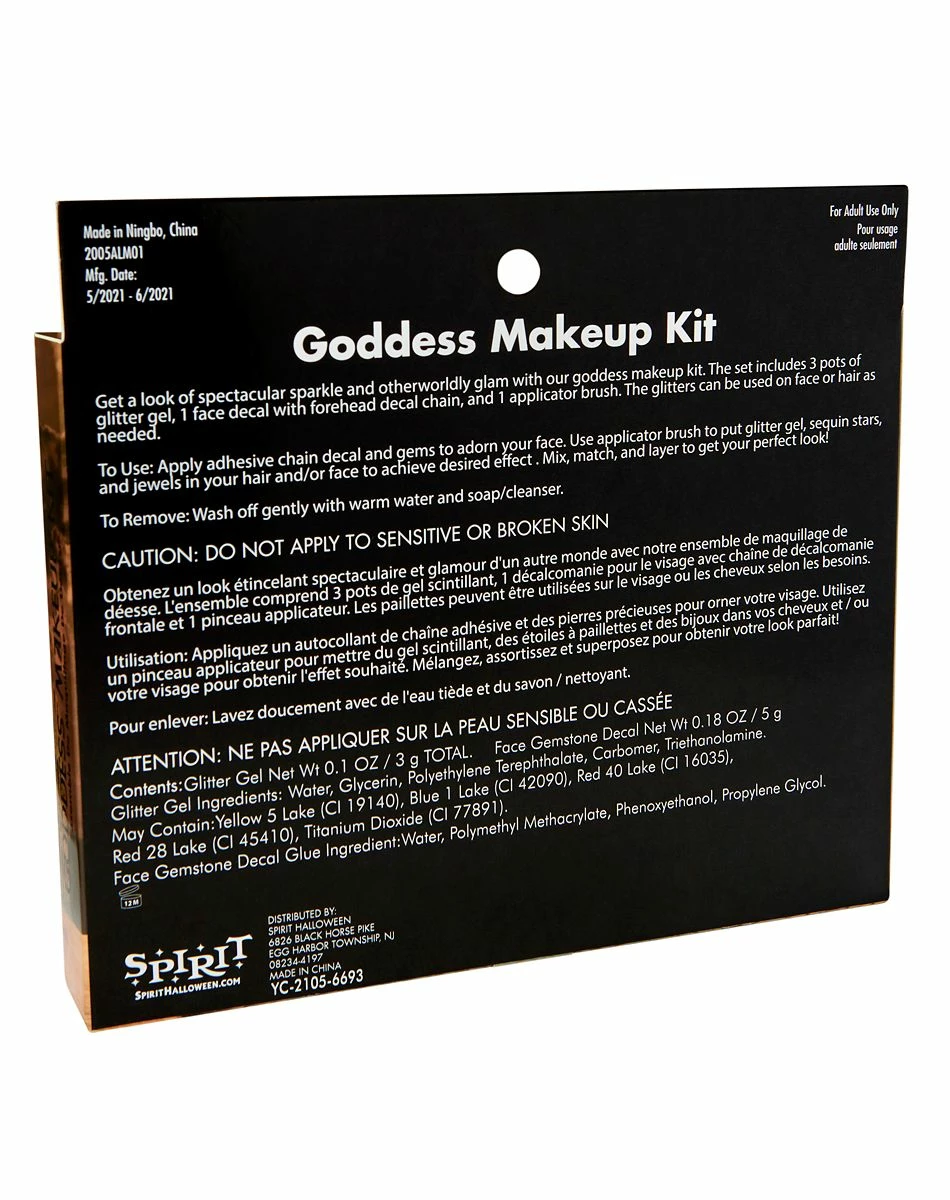 Achieve a spectacular style with this sparkling goddess makeup kit. This glam set includes 3 small pots of glitter gel that can be used on both skin and hair using the included applicator brush. A face decal with a forehead chain adds stunning shine to your look!