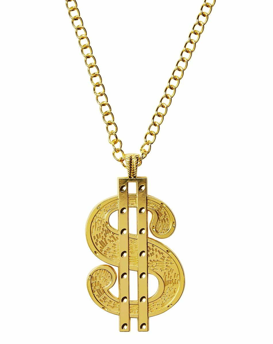 Keep yo mind on your money and the money on yo mind – wear too much bling you’ll make a brother go blind! Blind them when you complete your hip hop costume with this faux gold dollar sign necklace.