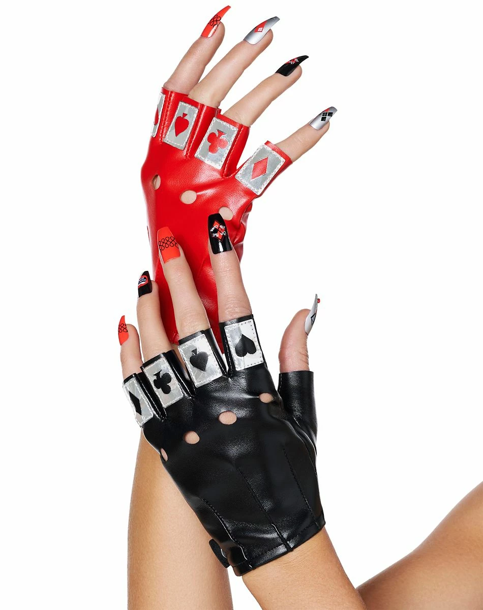 Look just like your favorite character when you put on these official red and black the Suicide Squad Harley Quinn fingerless gloves! These stylish gloves feature card suits in silver at the tops.
