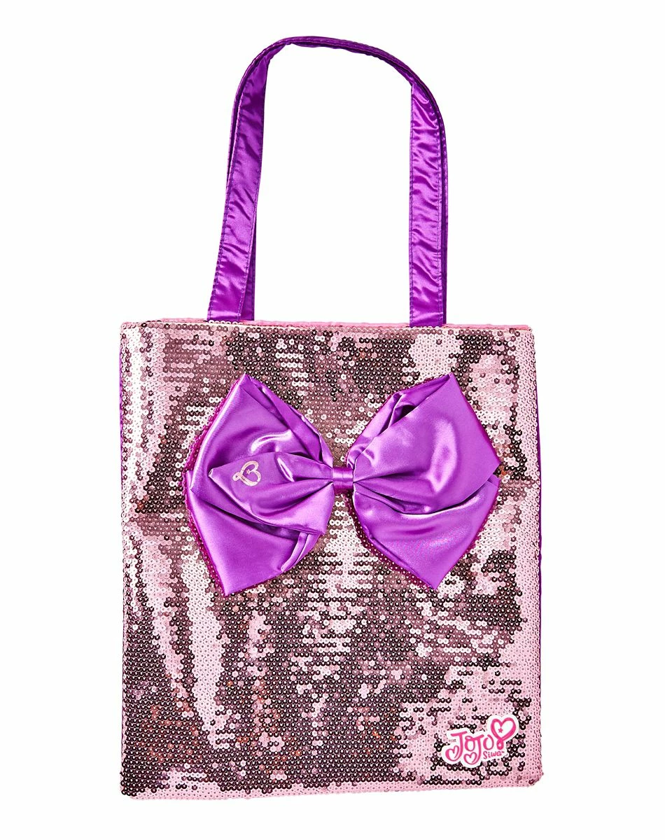 Carry all of your essentials in JoJo Siwa style with this officially licensed sequin bow tote bag! This bright and colorful bag features rose gold sequin detailing and a hot pink interior, and is centered with a vibrant purple bow! Strut your stuff like JoJo Siwa with this adorable tote bag!