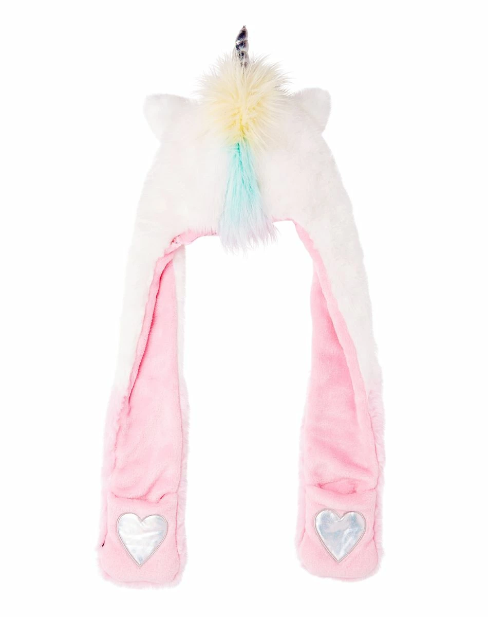 Add some cozy comfort to your unicorn costume with this fantastically fuzzy accessory! This fluffy white and pink unicorn hat features a pink and blue hair tuft, silvery ears and a horn, and long pieces that form into comfy, magical mittens. Complete the unicorn costume of your wildest fantasy with this enchanting accessory!