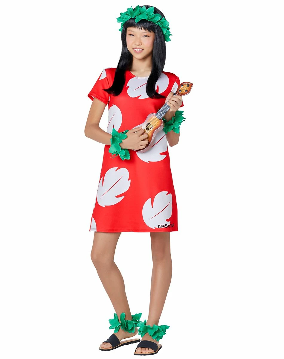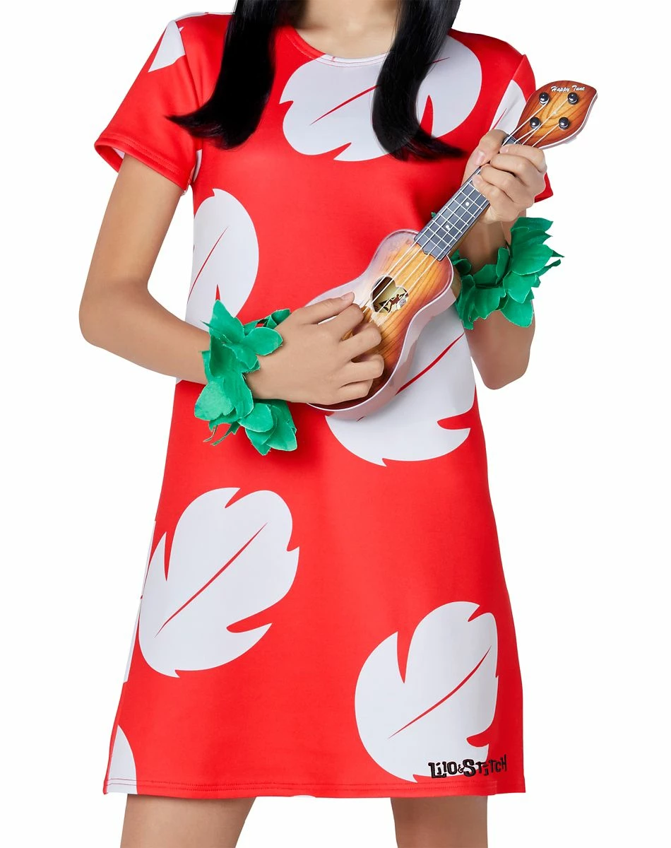 Make waves in this officially licensed Lilo & Stitch costume! This Lilo costume features a red dress with a bold white palm print, leafy head, wrist, and ankle accents, and a sleek brown wig. Get ready for an island adventure!