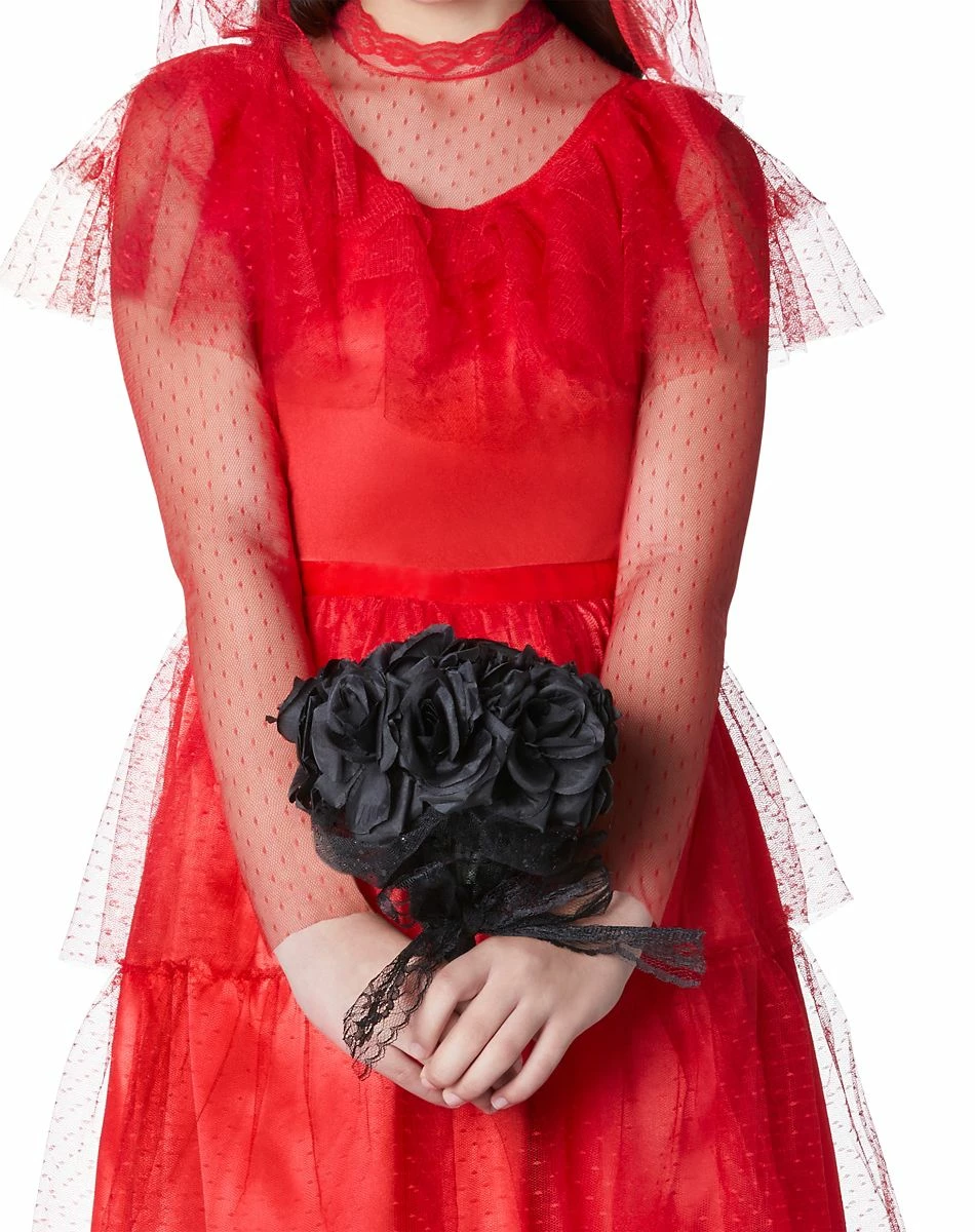 Step into Lydia’s ravishing red dress! This tiered red dress is inspired by the wedding dress worn by Lydia Deetz in Beetlejuice. Sheer red fabric adorns this long, eye-catching gown. A matching red clip-in veil will prepare you for even the wackiest of weddings.