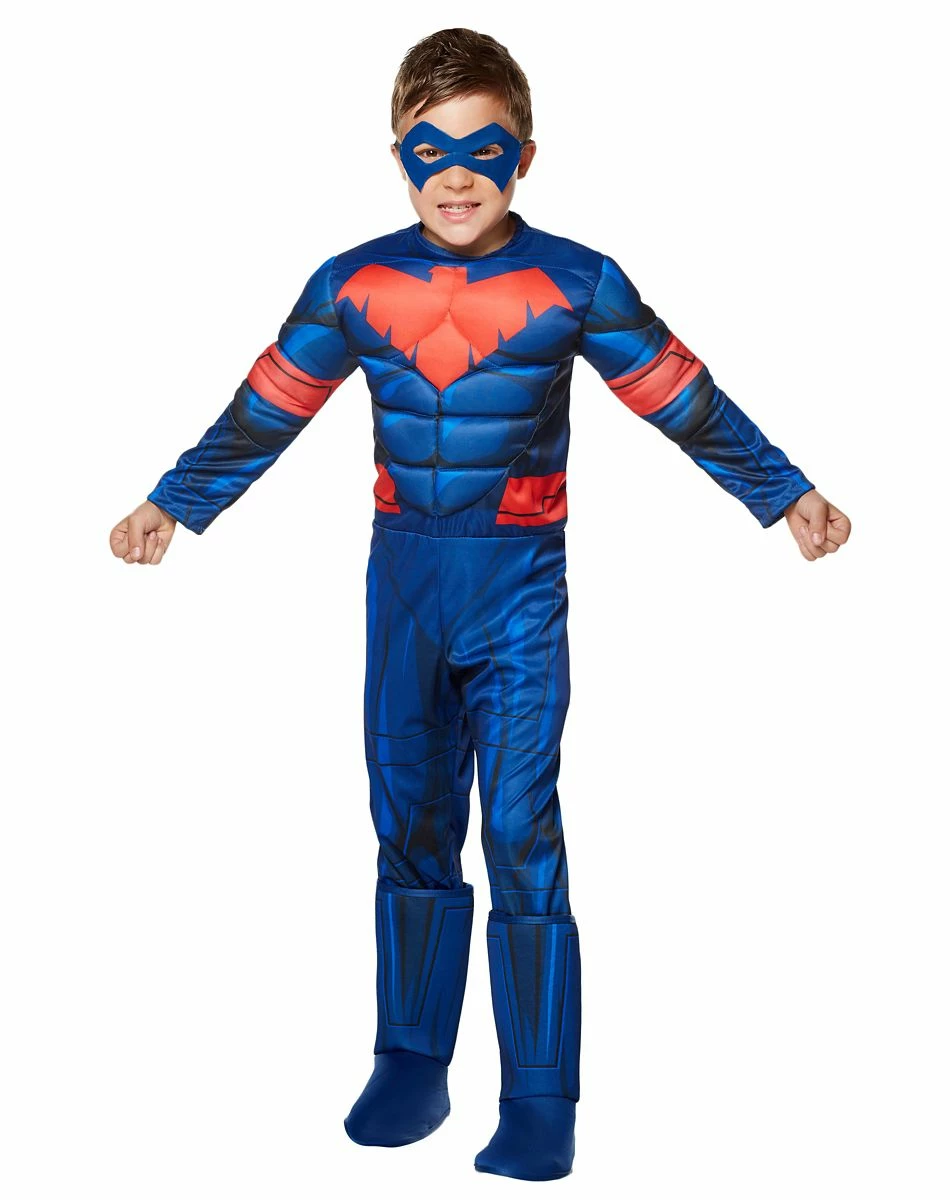 With acrobatic skills and guidance by Batman himself, this officially licensed Nightwing Deluxe Child Costume is sure to intimidate any villain roaming the streets! Features blue muscle chest jumpsuit with muscle graphics with black lines, red block detailing on hits and wrists, and the red Nightwing emblem on chest. Also features the blue Nightwing eye mask on black elastic. Become your own superhero as Nightwing and save Gotham from crime!