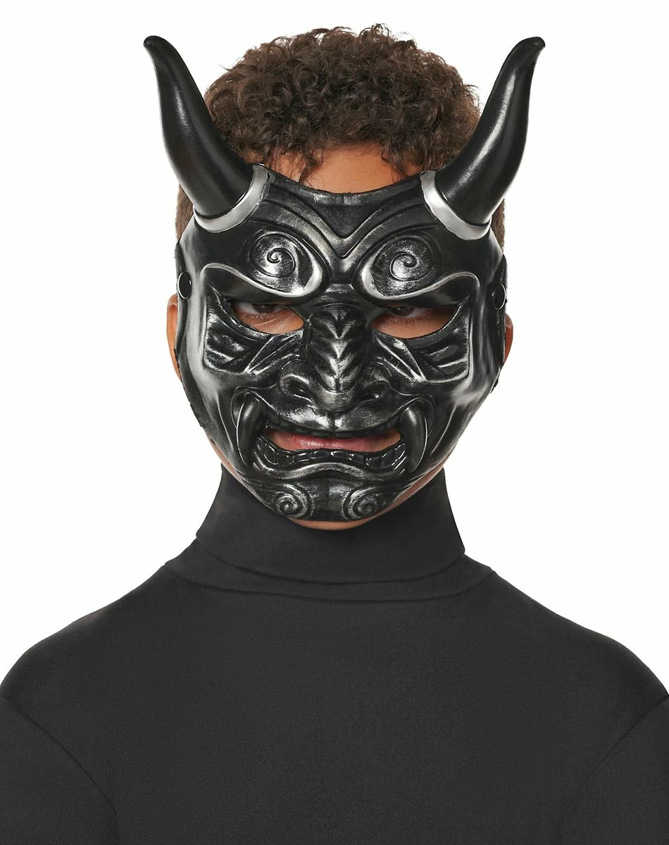 Become a powerful samurai with this kids half mask! This samurai mask features an all-black face with silver accents and an intimidating expression. An elastic band keeps this pliable mask comfortably in place.