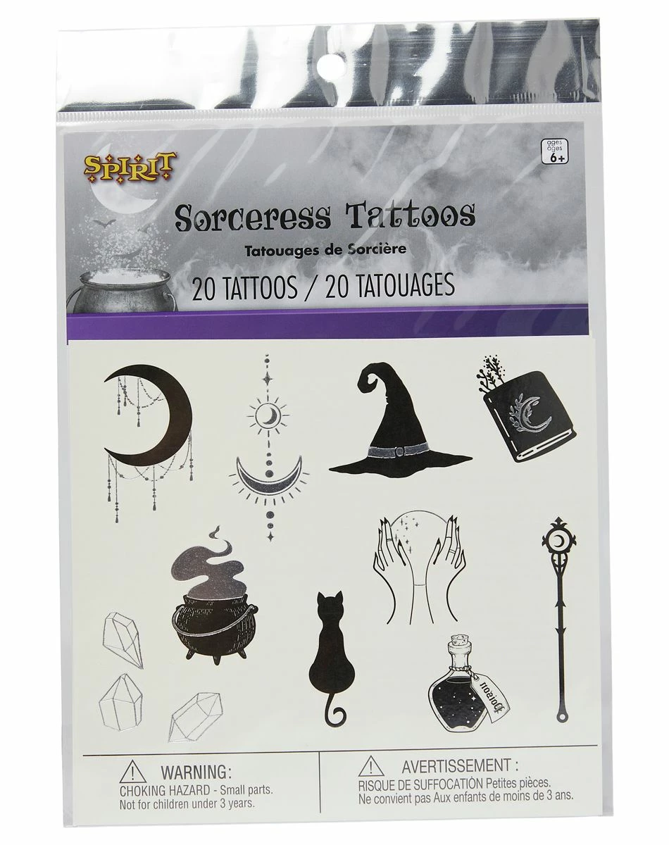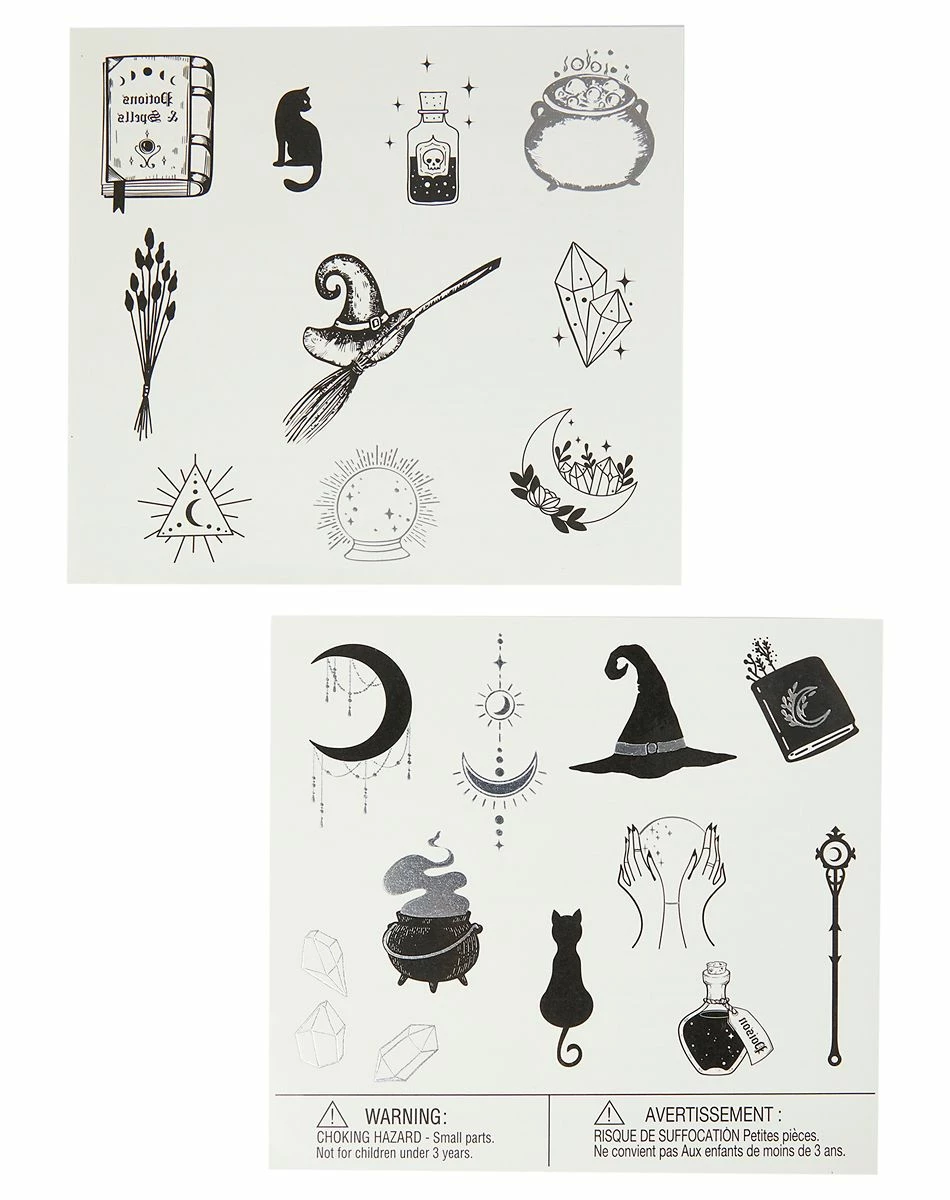 Embrace your witchy side with these kids’ sorceress tattoos! This temporary tattoo pack features an assortment of 20 black and silver witch-inspired graphics, including witch hats, black cats, moons, and more.