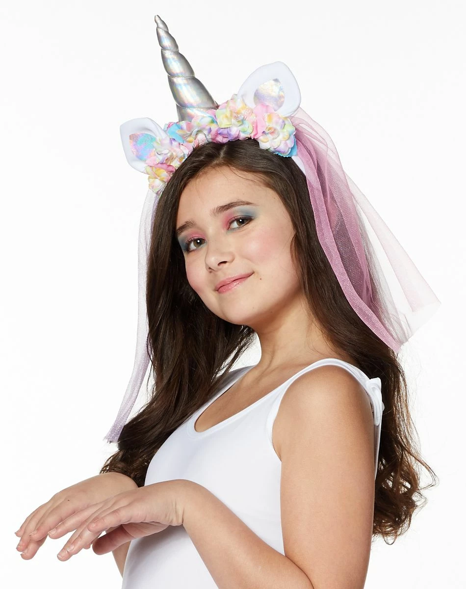 Add some flair to your fairytale costume with this enchanting unicorn veil. This glittery veil is topped with colorful flowers, ears, and, of course, a magical unicorn horn. Complete your fantastical costume with this dazzling accessory!