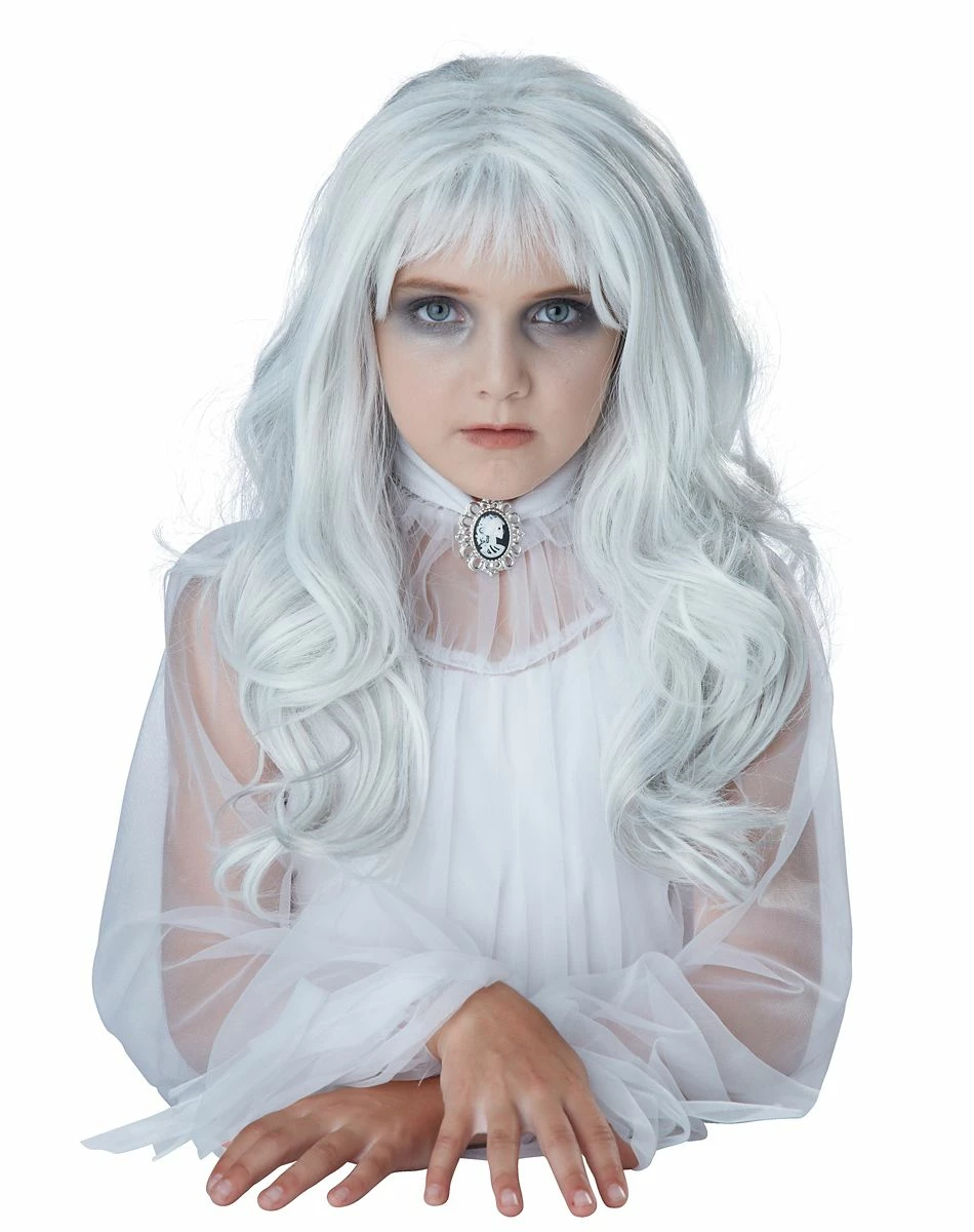 Look completely otherworldly in this lovely white ghost wig! This kids wig features a pale white coloring that will match with almost any supernatural theme and is sure to look hauntingly beautiful with almost any costume.