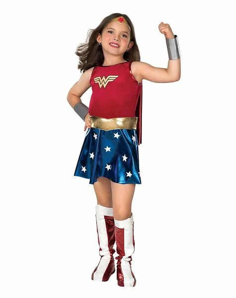 Fight or flight, you’ll love the officially licensed Wonder Woman Deluxe child costume. Have a powerful Halloween in the polyester/spandex blend dress with cape includes a gold belt, red and white boot tops, silvery bracelets and signature headpiece.