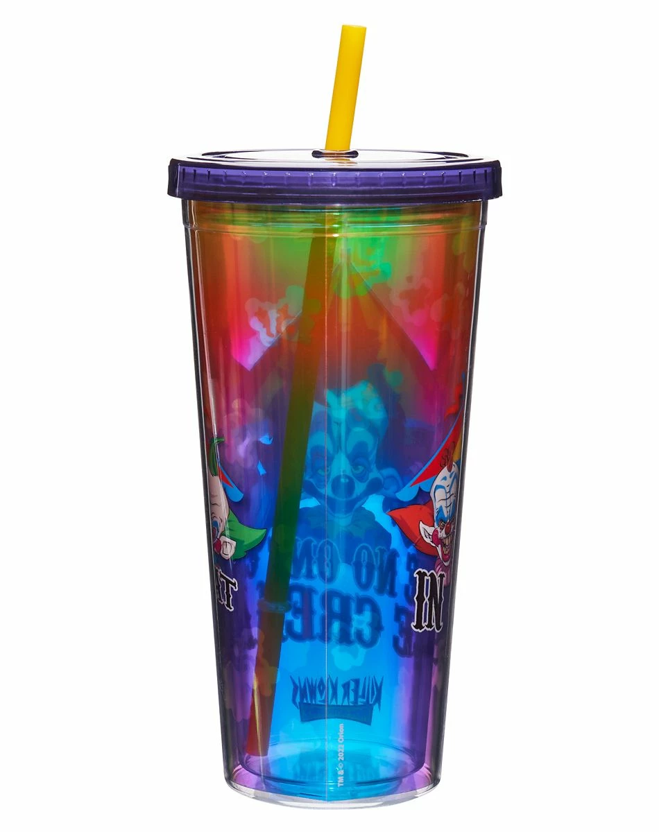 Show your love for your favorite cult classic horror film wherever you go with this Killer Klowns from Outer Space Cup with Straw! This officially licensed cup, which features your favorite wacky Klowns straight off of the big screen, is the perfect choice for anyone looking to sip their beverage is hilarious, horrifying style.