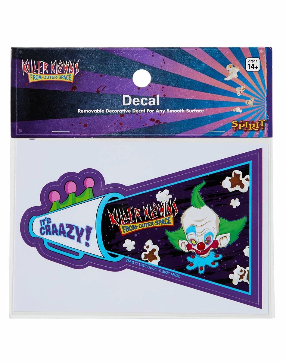 Use this official Killer Klowns from Outer Space Decal on your water bottle, laptop, notebook or anywhere else to show your fandom. This fun decal shows one of the killer klowns surrounded by kernels of popcorn with the words “It’s Craazy.” It’s the perfect decal for any movie buff.