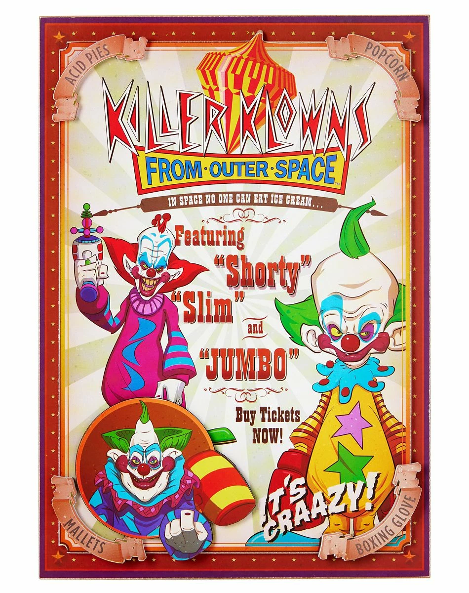 Transform your home into the craziest circus around with this Killer Klowns from Outer Space Tabletop Sign! Featuring all of your favorite Klowns including Shorty, Slim, and Jumbo, this decoration is the perfect choice for any fan of this memorable cult classic film.