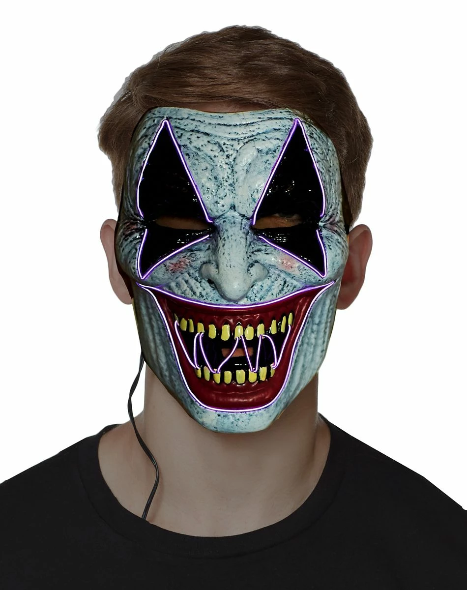 This murderous mask isn’t clowning around. You won’t want to find out why this creepy clown is smiling! The neon light trimmed eye and mouth details means that turning out the lights also turns up the terror from this sinister smiling menace.