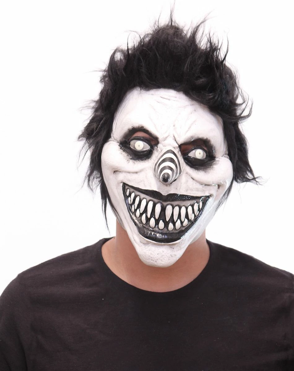 Pop goes the weasel… The nightmarish clown Laughing Jack returns in this demented mask. His pale white face features, black rings around the eyes, a black and white pointed nose, and an evil, twisted black lipped grin full of sharp teeth. This hand-painted mask will strike fear in anyone that has heard the tale of this demented killer clown!