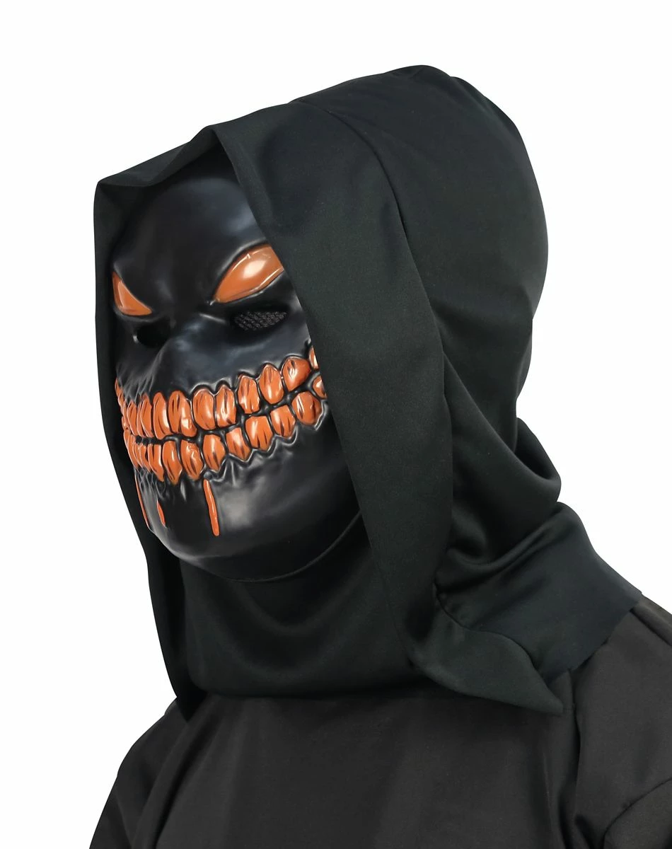 Become a stalker of the night looking to scare the life out of anyone who crosses your path this Halloween when you dress up in this Light-Up Hooded Nightstalker Mask. This mask features an all black face with orange eyes and a creepy orange smile that actually lights up and glows. This mask is perfect to go along with any all black outfit and is great for scaring your friends and family when they least expect it!