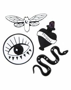 Add some magical style to your jacket, bag, shirt or anywhere else with this set of four black-and-white pins. Featuring a winged creature, a bottle of poison, a snake, and an eyeball, these pins are eye-catching accessories that’ll make everyone take notice.
