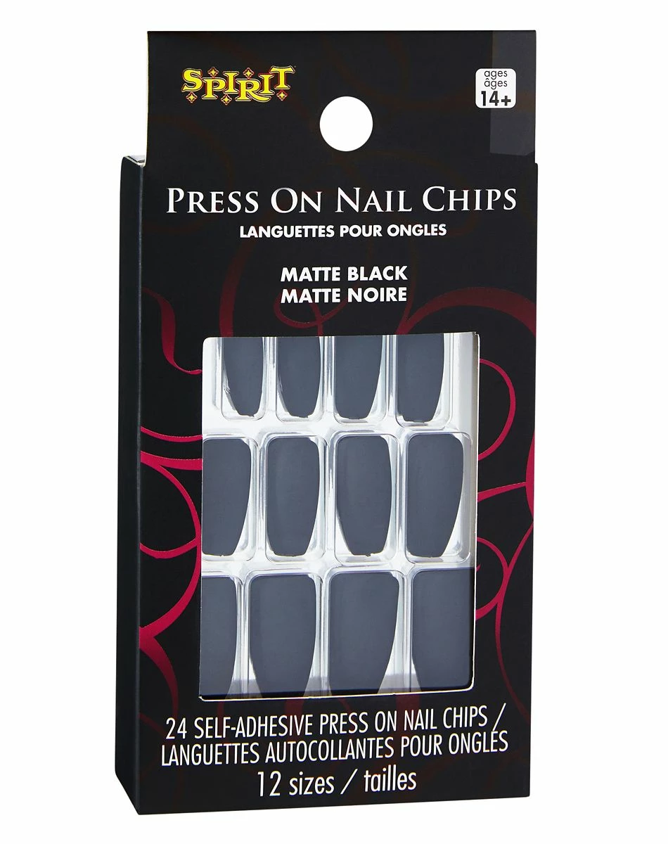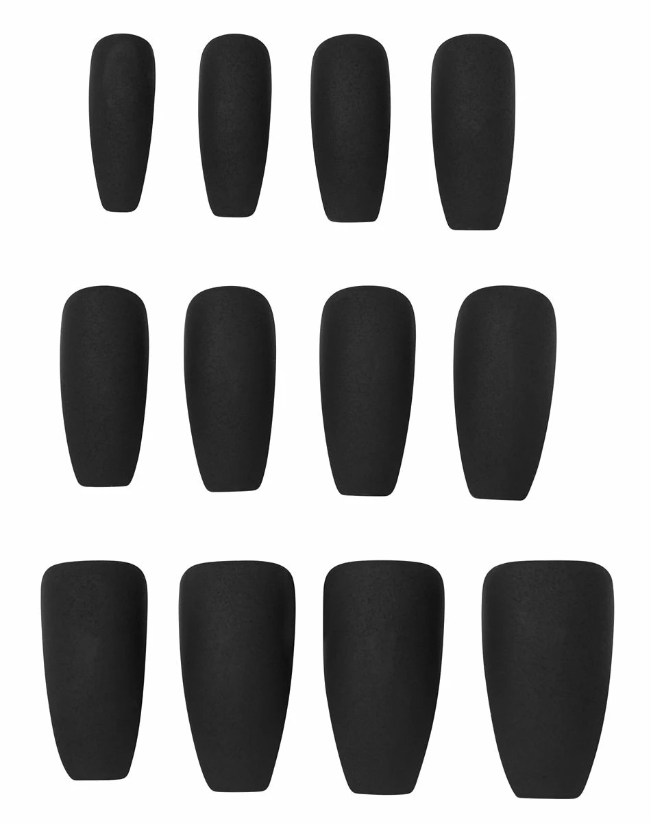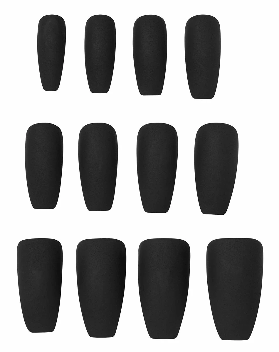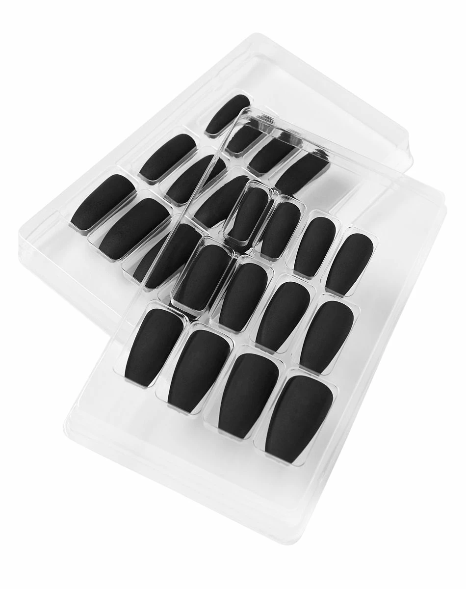 Complete your look with classic black nails. Matte black nails aren’t just for Halloween; these coffin-shaped press-on nails match your style any day of the year.