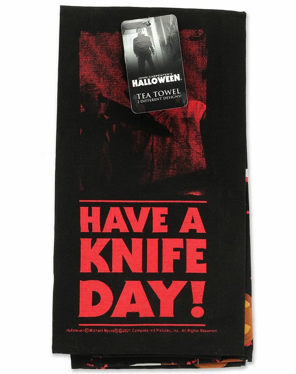 Show off your favorite horror movie every time you use these official Michael Myers Dish Towels! This two pack features two different designs, one in black and red with Michael Myers holding his knife and the words “Have a Knife Day!” and the other black dish towel featuring bloody knives and smiling pumpkins. Doing the dishes has never been so spooky!